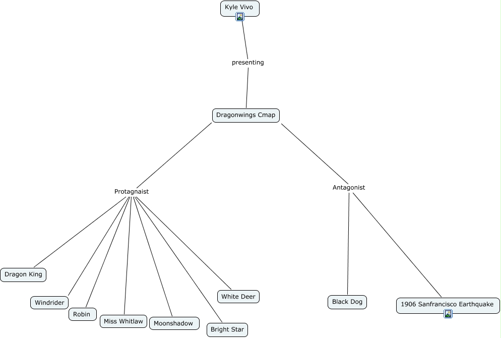 This Concept Map, created with IHMC CmapTools, has information related to: Airplane_Kyle VIvo, Dragonwings Cmap Protagnaist Robin, Dragonwings Cmap Protagnaist White Deer, Dragonwings Cmap Protagnaist Miss Whitlaw, Dragonwings Cmap Protagnaist Bright Star, Dragonwings Cmap Protagnaist Moonshadow, Kyle Vivo presenting Dragonwings Cmap, Dragonwings Cmap Protagnaist Dragon King, Dragonwings Cmap Antagonist Black Dog, Dragonwings Cmap Protagnaist Windrider, Dragonwings Cmap Antagonist 1906 Sanfrancisco Earthquake