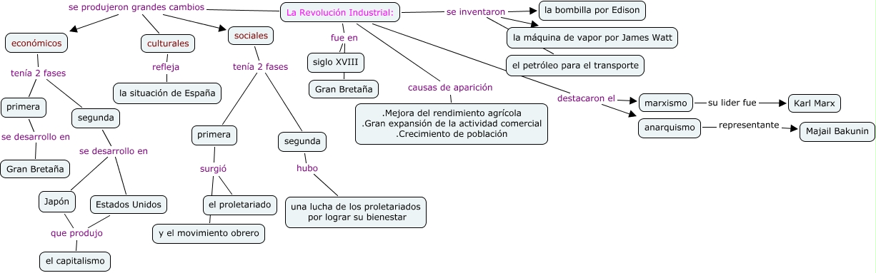 Este mapa conceptual tiene información relacionada a: 15.Patricia López Fuentes-Revolución Industrial, económicos tenía 2 fases primera, económicos tenía 2 fases segunda, primera surgió y el movimiento obrero, La Revolución Industrial: se inventaron la máquina de vapor por James Watt, La Revolución Industrial: destacaron el marxismo, sociales tenía 2 fases primera, La Revolución Industrial: se produjeron grandes cambios sociales, La Revolución Industrial: fue en Gran Bretaña, marxismo su lider fue Karl Marx, La Revolución Industrial: se inventaron el petróleo para el transporte, segunda hubo una lucha de los proletariados por lograr su bienestar, Japón que produjo el capitalismo, La Revolución Industrial: causas de aparición .Mejora del rendimiento agrícola .Gran expansión de la actividad comercial .Crecimiento de población, anarquismo representante Majail Bakunin, La Revolución Industrial: se produjeron grandes cambios económicos, Estados Unidos que produjo el capitalismo, primera se desarrollo en Gran Bretaña, culturales refleja la situación de España, La Revolución Industrial: fue en siglo XVIII, La Revolución Industrial: se inventaron la bombilla por Edison