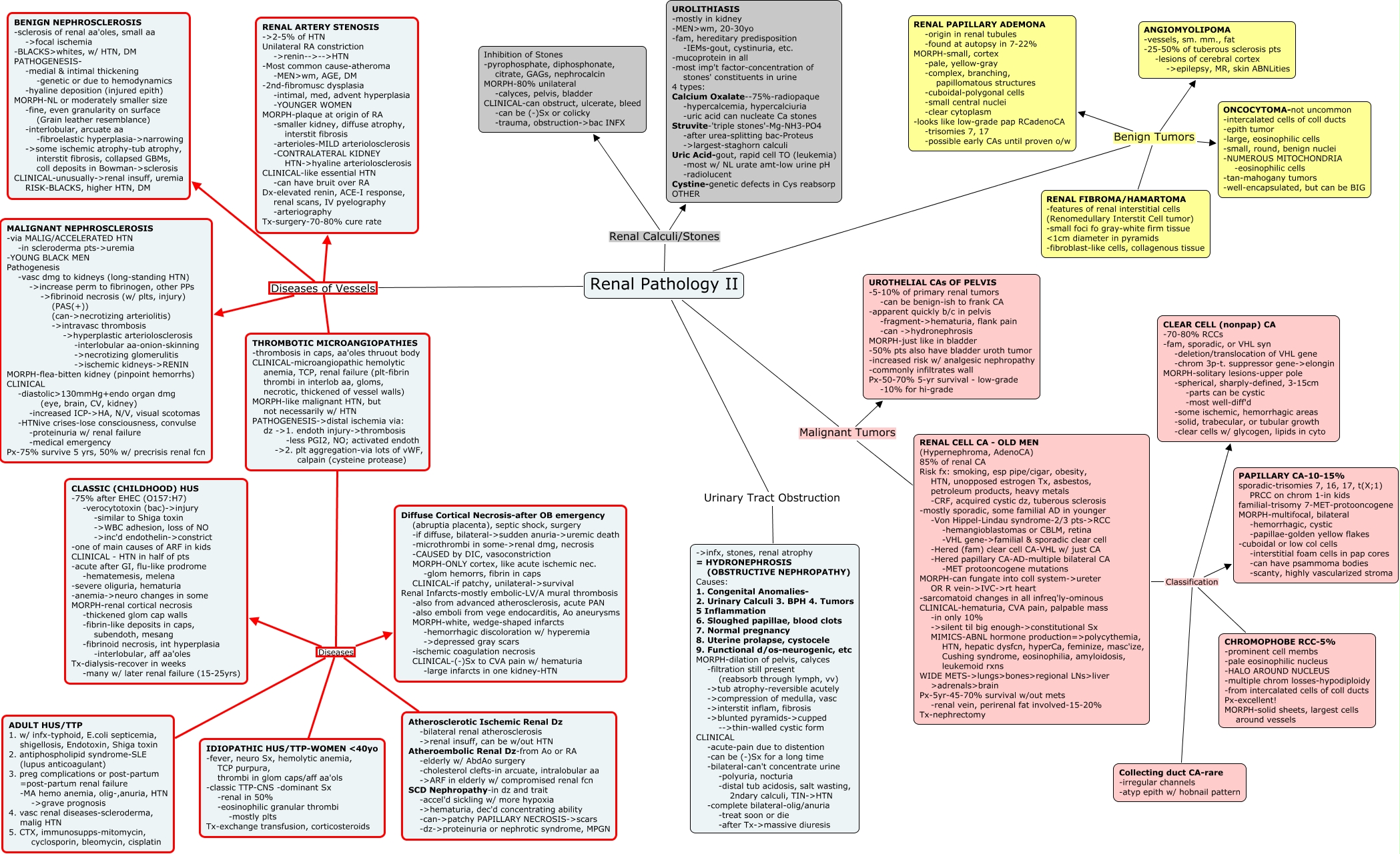 This Concept Map, created with IHMC CmapTools, has information related to: Kidney II, Renal Pathology II Renal Calculi/Stones UROLITHIASIS -mostly in kidney -MEN>wm, 20-30yo -fam, hereditary predisposition -IEMs-gout, cystinuria, etc. -mucoprotein in all -most imp't factor-concentration of stones' constituents in urine 4 types: Calcium Oxalate--75%-radiopaque -hypercalcemia, hypercalciuria -uric acid can nucleate Ca stones Struvite-'triple stones'-Mg-NH3-PO4 -after urea-splitting bac-Proteus ->largest-staghorn calculi Uric Acid-gout, rapid cell TO (leukemia) -most w/ NL urate amt-low urine pH -radiolucent Cystine-genetic defects in Cys reabsorp OTHER, RENAL CELL CA - OLD MEN (Hypernephroma, AdenoCA) 85% of renal CA Risk fx: smoking, esp pipe/cigar, obesity, HTN, unopposed estrogen Tx, asbestos, petroleum products, heavy metals -CRF, acquired cystic dz, tuberous sclerosis -mostly sporadic, some familial AD in younger -Von Hippel-Lindau syndrome-2/3 pts->RCC -hemangioblastomas or CBLM, retina -VHL gene->familial & sporadic clear cell -Hered (fam) clear cell CA-VHL w/ just CA -Hered papillary CA-AD-multiple bilateral CA -MET protooncogene mutations MORPH-can fungate into coll system->ureter OR R vein->IVC->rt heart -sarcomatoid changes in all infreq'ly-ominous CLINICAL-hematuria, CVA pain, palpable mass -in only 10% ->silent til big enough->constitutional Sx MIMICS-ABNL hormone production=>polycythemia, HTN, hepatic dysfcn, hyperCa, feminize, masc'ize, Cushing syndrome, eosinophilia, amyloidosis, leukemoid rxns WIDE METS->lungs>bones>regional LNs>liver >adrenals>brain Px-5yr-45-70% survival w/out mets -renal vein, perirenal fat involved-15-20% Tx-nephrectomy Classification Collecting duct CA-rare -irregular channels -atyp epith w/ hobnail pattern, Renal Pathology II Diseases of Vessels BENIGN NEPHROSCLEROSIS -sclerosis of renal aa'oles, small aa ->focal ischemia -BLACKS>whites, w/ HTN, DM PATHOGENESIS- -medial & intimal thickening -genetic or due to hemodynamics -hyaline deposition (injured epith) MORPH-NL or moderately smaller size -fine, even granularity on surface (Grain leather resemblance) -interlobular, arcuate aa -fibroelastic hyperplasia->narrowing ->some ischemic atrophy-tub atrophy, interstit fibrosis, collapsed GBMs, coll deposits in Bowman->sclerosis CLINICAL-unusually->renal insuff, uremia RISK-BLACKS, higher HTN, DM, Renal Pathology II Diseases of Vessels MALIGNANT NEPHROSCLEROSIS -via MALIG/ACCELERATED HTN -in scleroderma pts->uremia -YOUNG BLACK MEN Pathogenesis -vasc dmg to kidneys (long-standing HTN) ->increase perm to fibrinogen, other PPs ->fibrinoid necrosis (w/ plts, injury) (PAS(+)) (can->necrotizing arteriolitis) ->intravasc thrombosis ->hyperplastic arteriolosclerosis -interlobular aa-onion-skinning ->necrotizing glomerulitis ->ischemic kidneys->RENIN MORPH-flea-bitten kidney (pinpoint hemorrhs) CLINICAL -diastolicmmHg+endo organ dmg (eye, brain, CV, kidney) -increased ICP->HA, N/V, visual scotomas -HTNive crises-lose consciousness, convulse -proteinuria w/ renal failure -medical emergency Px-75% survive 5 yrs, 50% w/ precrisis renal fcn, Renal Pathology II Diseases of Vessels THROMBOTIC MICROANGIOPATHIES -thrombosis in caps, aa'oles thruout body CLINICAL-microangiopathic hemolytic anemia, TCP, renal failure (plt-fibrin thrombi in interlob aa, gloms, necrotic, thickened of vessel walls) MORPH-like malignant HTN, but not necessarily w/ HTN PATHOGENESIS->distal ischemia via: dz -ɭ. endoth injury->thrombosis -less PGI2, NO; activated endoth -ɮ. plt aggregation-via lots of vWF, calpain (cysteine protease), THROMBOTIC MICROANGIOPATHIES -thrombosis in caps, aa'oles thruout body CLINICAL-microangiopathic hemolytic anemia, TCP, renal failure (plt-fibrin thrombi in interlob aa, gloms, necrotic, thickened of vessel walls) MORPH-like malignant HTN, but not necessarily w/ HTN PATHOGENESIS->distal ischemia via: dz -ɭ. endoth injury->thrombosis -less PGI2, NO; activated endoth -ɮ. plt aggregation-via lots of vWF, calpain (cysteine protease) Diseases IDIOPATHIC HUS/TTP-WOMEN មyo -fever, neuro Sx, hemolytic anemia, TCP purpura, thrombi in glom caps/aff aa'ols -classic TTP-CNS -dominant Sx -renal in 50% -eosinophilic granular thrombi -mostly plts Tx-exchange transfusion, corticosteroids, Renal Pathology II Benign Tumors RENAL FIBROMA/HAMARTOMA -features of renal interstitial cells (Renomedullary Interstit Cell tumor) -small foci fo gray-white firm tissue əcm diameter in pyramids -fibroblast-like cells, collagenous tissue, THROMBOTIC MICROANGIOPATHIES -thrombosis in caps, aa'oles thruout body CLINICAL-microangiopathic hemolytic anemia, TCP, renal failure (plt-fibrin thrombi in interlob aa, gloms, necrotic, thickened of vessel walls) MORPH-like malignant HTN, but not necessarily w/ HTN PATHOGENESIS->distal ischemia via: dz -ɭ. endoth injury->thrombosis -less PGI2, NO; activated endoth -ɮ. plt aggregation-via lots of vWF, calpain (cysteine protease) Diseases ADULT HUS/TTP 1. w/ infx-typhoid, E.coli septicemia, shigellosis, Endotoxin, Shiga toxin 2. antiphospholipid syndrome-SLE (lupus anticoagulant) 3. preg complications or post-partum =post-partum renal failure -MA hemo anemia, olig-,anuria, HTN ->grave prognosis 4. vasc renal diseases-scleroderma, malig HTN 5. CTX, immunosupps-mitomycin, cyclosporin, bleomycin, cisplatin, THROMBOTIC MICROANGIOPATHIES -thrombosis in caps, aa'oles thruout body CLINICAL-microangiopathic hemolytic anemia, TCP, renal failure (plt-fibrin thrombi in interlob aa, gloms, necrotic, thickened of vessel walls) MORPH-like malignant HTN, but not necessarily w/ HTN PATHOGENESIS->distal ischemia via: dz -ɭ. endoth injury->thrombosis -less PGI2, NO; activated endoth -ɮ. plt aggregation-via lots of vWF, calpain (cysteine protease) Diseases CLASSIC (CHILDHOOD) HUS -75% after EHEC (O157:H7) -verocytotoxin (bac)->injury -similar to Shiga toxin ->WBC adhesion, loss of NO ->inc'd endothelin->constrict -one of main causes of ARF in kids CLINICAL - HTN in half of 