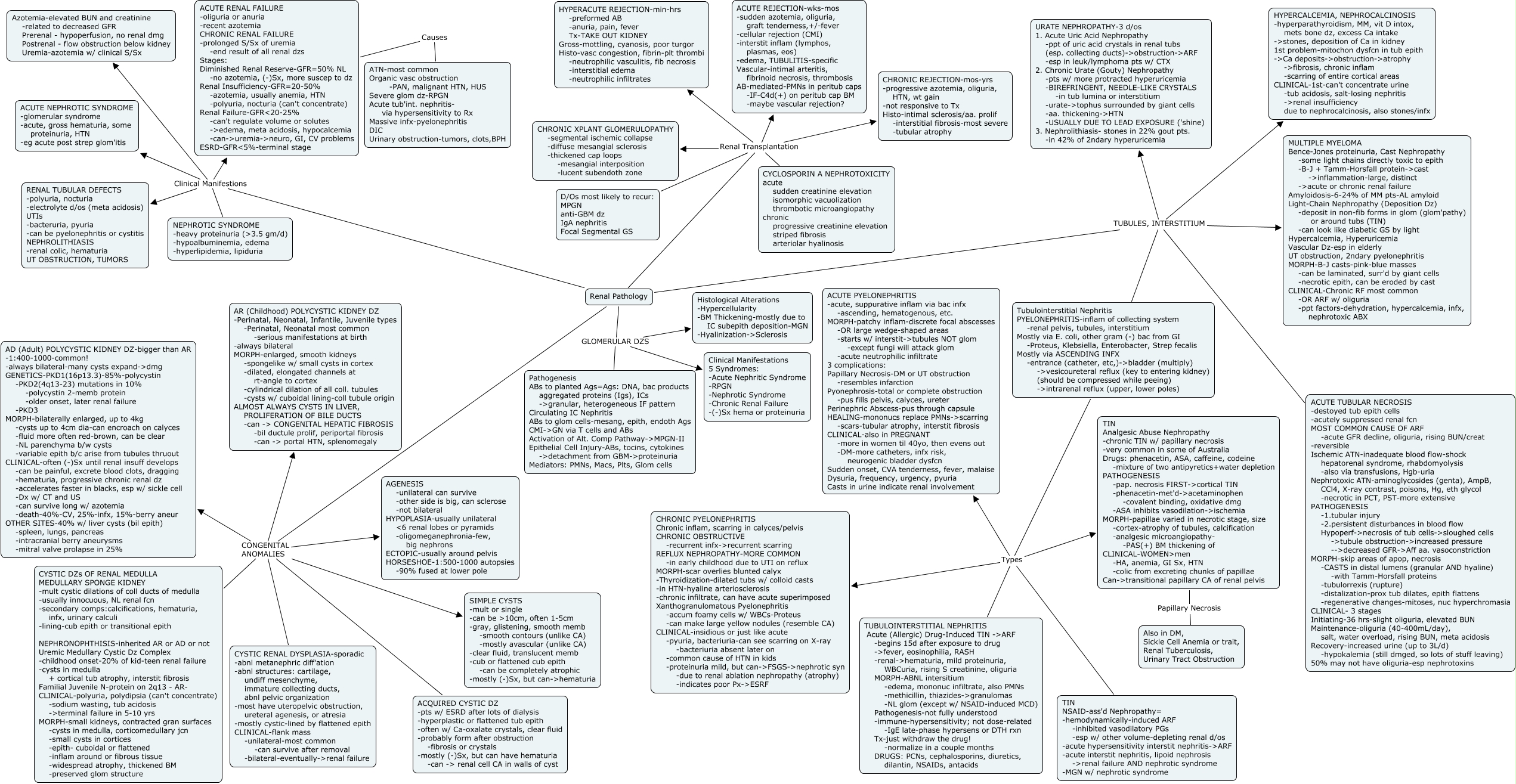 This Concept Map, created with IHMC CmapTools, has information related to: Kidney I, Renal Pathology GLOMERULAR DZS Clinical Manifestations 5 Syndromes: -Acute Nephritic Syndrome -RPGN -Nephrotic Syndrome -Chronic Renal Failure -(-)Sx hema or proteinuria, Tubulointerstitial Nephritis PYELONEPHRITIS-inflam of collecting system -renal pelvis, tubules, interstitium Mostly via E. coli, other gram (-) bac from GI -Proteus, Klebsiella, Enterobacter, Strep fecalis Mostly via ASCENDING INFX -entrance (catheter, etc,)->bladder (multiply) ->vesicoureteral reflux (key to entering kidney) (should be compressed while peeing) ->intrarenal reflux (upper, lower poles) Types TIN NSAID-ass'd Nephropathy= -hemodynamically-induced ARF -inhibited vasodilatory PGs -esp w/ other volume-depleting renal d/os -acute hypersensitivity interstit nephritis->ARF -acute interstit nephritis, lipoid nephrosis ->renal failure AND nephrotic syndrome -MGN w/ nephrotic syndrome, Renal Pathology TUBULES, INTERSTITIUM Tubulointerstitial Nephritis PYELONEPHRITIS-inflam of collecting system -renal pelvis, tubules, interstitium Mostly via E. coli, other gram (-) bac from GI -Proteus, Klebsiella, Enterobacter, Strep fecalis Mostly via ASCENDING INFX -entrance (catheter, etc,)->bladder (multiply) ->vesicoureteral reflux (key to entering kidney) (should be compressed while peeing) ->intrarenal reflux (upper, lower poles), Renal Pathology Renal Transplantation CHRONIC XPLANT GLOMERULOPATHY -segmental ischemic collapse -diffuse mesangial sclerosis -thickened cap loops -mesangial interposition -lucent subendoth zone, Renal Pathology CONGENITAL ANOMALIES AGENESIS -unilateral can survive -other side is big, can sclerose -not bilateral HYPOPLASIA-usually unilateral ɞ renal lobes or pyramids -oligomeganephronia-few, big nephrons ECTOPIC-usually around pelvis HORSESHOE-1:500-1000 autopsies -90% fused at lower pole, Renal Pathology GLOMERULAR DZS Histological Alterations -Hypercellularity -BM Thickening-mostly due to IC subepith deposition-MGN -Hyalinization->Sclerosis, Tubulointerstitial Nephritis PYELONEPHRITIS-inflam of collecting system -renal pelvis, tubules, interstitium Mostly via E. coli, other gram (-) bac from GI -Proteus, Klebsiella, Enterobacter, Strep fecalis Mostly via ASCENDING INFX -entrance (catheter, etc,)->bladder (multiply) ->vesicoureteral reflux (key to entering kidney) (should be compressed while peeing) ->intrarenal reflux (upper, lower poles) Types CHRONIC PYELONEPHRITIS Chronic inflam, scarring in calyces/pelvis CHRONIC OBSTRUCTIVE -recurrent infx->recurrent scarring REFLUX NEPHROPATHY-MORE COMMON -in early childhood due to UTI on reflux MORPH-scar overlies blunted calyx -Thyroidization-dilated tubs w/ colloid casts -in HTN-hyaline arteriosclerosis -chronic infiltrate, can have acute superimposed Xanthogranulomatous Pyelonephritis -accum foamy cells w/ WBCs-Proteus -can make large yellow nodules (resemble CA) CLINICAL-insidious or just like acute -pyuria, bacteriuria-can see scarring on X-ray -bacteriuria absent later on -common cause of HTN in kids -proteinuria mild, but can->FSGS->nephrotic syn -due to renal ablation nephropathy (atrophy) -indicates poor Px->ESRF, Renal Pathology Renal Transplantation CYCLOSPORIN A NEPHROTOXICITY acute sudden creatinine elevation isomorphic vacuolization thrombotic microangiopathy chronic progressive creatinine elevation striped fibrosis arteriolar hyalinosis, Tubulointerstitial Nephritis PYELONEPHRITIS-inflam of collecting system -renal pelvis, tubules, interstitium Mostly via E. coli, other gram (-) bac from GI -Proteus, Klebsiella, Enterobacter, Strep fecalis Mostly via ASCENDING INFX -entrance (catheter, etc,)->bladder (multiply) ->vesicoureteral reflux (key to entering kidney) (should be compressed while peeing) ->intrarenal reflux (upper, lower poles) Types TUBULOINTERSTITIAL NEPHRITIS Acute (Allergic) Drug-Induced TIN ->ARF -begins 15d after exposure to drug ->fever, eosinophilia, RASH -renal->hematuria, mild proteinuria, WBCuria, rising S creatinine, oliguria MORPH-ABNL intersitium -edema, mononuc infiltrate, also PMNs -methicillin, thiazides->granulomas -NL glom (except w/ NSAID-induced MCD) Pathogenesis-not fully understood -immune-hypersensitivity; not dose-related -IgE late-phase hypersens or DTH rxn Tx-just withdraw the drug! -normalize in a couple months DRUGS: PCNs, cephalosporins, diuretics, dilantin, NSAIDs, antacids, Renal Pathology TUBULES, INTERSTITIUM MULTIPLE MYELOMA Bence-Jones proteinuria, Cast Nephropathy -some light chains directly toxic to epith -B-J + Tamm-Horsfall protein->cast ->inflammation-large, distinct ->acute or chronic renal failure Amyloidosis-6-24% of MM pts-AL amyloid Light-Chain Nephropathy (Deposition Dz) -deposit in non-fib forms in glom (glom'pathy) or around tubs (TIN) -can look like diabetic GS by light Hypercalcemia, Hyperuricemia Vascular Dz-esp in elderly UT obstruction, 2ndary pyelonephritis MORPH-B-J casts-pink-blue masses -can be laminated, surr'd by giant cells -necrotic epith, can be eroded by cast CLINICAL-Chronic RF most common -OR ARF w/ oliguria -ppt factors-dehydration, hypercalcemia, infx, nephrotoxic ABX, Tubulointerstitial Nephritis PYELONEPHRITIS-inflam of collecting system -renal pelvis, tubules, interstitium Mostly via E. coli, other gram (-) bac from GI -Proteus, Klebsiella, Enterobacter, Strep fecalis Mostly via ASCENDING INFX -entrance (catheter, etc,)->bladder (multiply) ->vesicoureteral reflux (key to entering kidney) (should be compressed while peeing) ->intrarenal reflux (upper, lower poles) Types TIN Analgesic Abuse Nephropathy -chronic TIN w/ papillary necrosis -very common in some of Australia Drugs: phenacetin, ASA, caffeine, codeine -mixture of two antipyretics+water depletion PATHOGENESIS -pap. necrosis FIRST->cortical TIN -phenacetin-met'd->acetaminophen -covalent binding, oxidative dmg -ASA inhibits vasodilation->ischemia MORPH-papillae varied in necrotic stage, size -cortex-atrophy of tubules, calcif