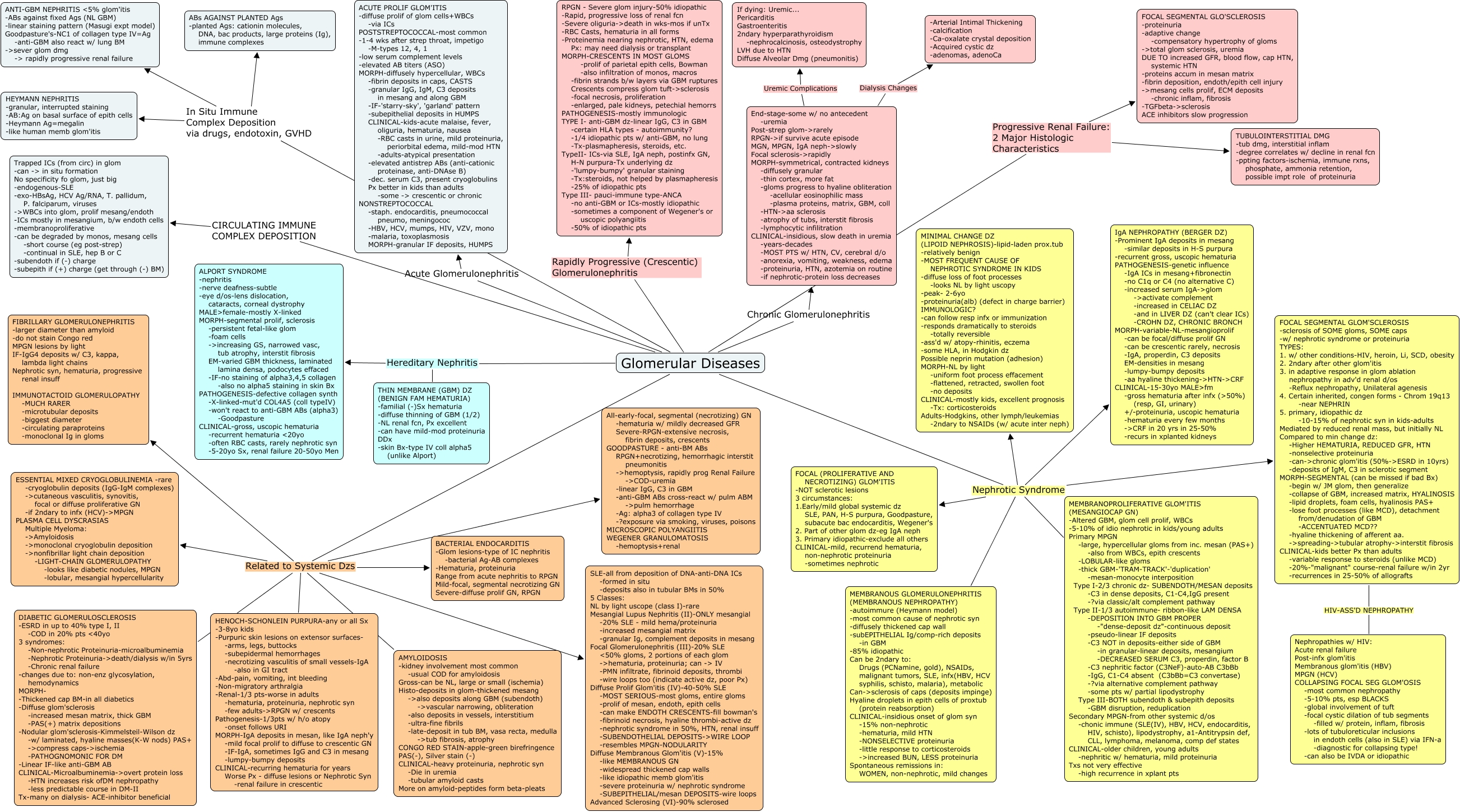 This Concept Map, created with IHMC CmapTools, has information related to: Glomerular Diseases, Glomerular Diseases Nephrotic Syndrome MEMBRANOUS GLOMERULONEPHRITIS (MEMBRANOUS NEPHROPATHY) -autoimmure (Heymann model) -most common cause of nephrotic syn -diffusely thickened cap wall -subEPITHELIAL Ig/comp-rich deposits -in GBM -85% idiopathic Can be 2ndary to: Drugs (PCNamine, gold), NSAIDs, malignant tumors, SLE, infx(HBV, HCV syphilis, schisto, malaria), metabolic Can->sclerosis of caps (deposits impinge) Hyaline droplets in epith cells of proxtub (protein reabsorption) CLINICAL-insidious onset of glom syn -15% non-nephrotic -hematuria, mild HTN -NONSELECTIVE proteinuria -little response to corticosteroids ->increased BUN, LESS proteinuria Spontaneous remissions in: WOMEN, non-nephrotic, mild changes, Glomerular Diseases Progressive Renal Failure: 2 Major Histologic Characteristics TUBULOINTERSTITIAL DMG -tub dmg, interstitial inflam -degree correlates w/ decline in renal fcn -ppting factors-ischemia, immune rxns, phosphate, ammonia retention, possible impt role of proteinuria, Glomerular Diseases In Situ Immune Complex Deposition via drugs, endotoxin, GVHD HEYMANN NEPHRITIS -granular, interrupted staining -AB:Ag on basal surface of epith cells -Heymann Ag=megalin -like human memb glom'itis, Glomerular Diseases Nephrotic Syndrome MEMBRANOPROLIFERATIVE GLOM'ITIS (MESANGIOCAP GN) -Altered GBM, glom cell prolif, WBCs -5-10% of idio nephrotic in kids/young adults Primary MPGN -large, hypercellular gloms from inc. mesan (PAS+) -also from WBCs, epith crescents -LOBULAR-like gloms -thick GBM-'TRAM-TRACK'-'duplication' -mesan-monocyte interposition Type I-2/3 chronic dz- SUBENDOTH/MESAN deposits -C3 in dense deposits, C1-C4,IgG present -?via classic/alt complement pathway Type II-1/3 autoimmune- ribbon-like LAM DENSA -DEPOSITION INTO GBM PROPER -"dense-deposit dz"-continuous deposit -pseudo-linear IF deposits -C3 NOT in deposits-either side of GBM -in granular-linear deposits, mesangium -DECREASED SERUM C3, properdin, factor B -C3 nephritic factor (C3NeF)-auto-AB C3bBb -IgG, C1-C4 absent (C3bBb=C3 convertase) -?via alternative complement pathway -some pts w/ partial lipodystrophy Type III-BOTH subendoth & subepith deposits -GBM disruption, reduplication Secondary MPGN-from other systemic d/os -chonic immune (SLE(IV), HBV, HCV, endocarditis, HIV, schisto), lipodystrophy, a1-Antitrypsin def, CLL, lymphoma, melanoma, comp def states CLINICAL-older children, young adults -nephritic w/ hematuria, mild proteinuria Txs not very effective -high recurrence in xplant pts, Glomerular Diseases Nephrotic Syndrome FOCAL (PROLIFERATIVE AND NECROTIZING) GLOM'ITIS -NOT sclerotic lesions 3 circumstances: 1.Early/mild global systemic dz SLE, PAN, H-S purpura, Goodpasture, subacute bac endocarditis, Wegener's 2. Part of other glom dz-eg IgA neph 3. Primary idiopathic-exclude all others CLINICAL-mild, recurrend hematuria, non-nephrotic proteinuria -sometimes nephrotic, Glomerular Diseases Hereditary Nephritis THIN MEMBRANE (GBM) DZ (BENIGN FAM HEMATURIA) -familial (-)Sx hematuria -diffuse thinning of GBM (1/2) -NL renal fcn, Px excellent -can have mild-mod proteinuria DDx -skin Bx-type IV coll alpha5 (unlike Alport), Glomerular Diseases Nephrotic Syndrome IgA NEPHROPATHY (BERGER DZ) -Prominent IgA deposits in mesang -similar deposits in H-S purpura -recurrent gross, uscopic hematuria PATHOGENESIS-genetic influence -IgA ICs in mesang+fibronectin -no C1q or C4 (no alternative C) -increased serum IgA->glom ->activate complement -increased in CELIAC DZ -and in LIVER DZ (can't clear ICs) -CROHN DZ, CHRONIC BRONCH MORPH-variable-NL-mesangioprolif -can be focal/diffuse prolif GN -can be crescentic rarely, necrosis -IgA, properdin, C3 deposits EM-densities in mesang -lumpy-bumpy deposits -aa hyaline thickening->HTN->CRF CLINICAL-15-30yo MALE>fm -gross hematuria after infx (ᡪ%) (resp, GI, urinary) +/-proteinuria, uscopic hematuria -hematuria every few months ->CRF in 20 yrs in 25-50% -recurs in xplanted kidneys, Glomerular Diseases In Situ Immune Complex Deposition via drugs, endotoxin, GVHD ANTI-GBM NEPHRITIS ɝ% glom'itis -ABs against fixed Ags (NL GBM) -linear staining pattern (Masugi expt model) Goodpasture's-NC1 of collagen type IV=Ag -anti-GBM also react w/ lung BM ->sever glom dmg -> rapidly progressive renal failure, Glomerular Diseases Progressive Renal Failure: 2 Major Histologic Characteristics FOCAL SEGMENTAL GLO'SCLEROSIS -proteinuria -adaptive change -compensatory hypertrophy of gloms ->total glom sclerosis, uremia DUE TO increased GFR, blood flow, cap HTN, systemic HTN -proteins accum in mesan matrix -fibrin deposition, endoth/epith cell injury ->mesang cells prolif, ECM deposits -chronic inflam, fibrosis -TGFbeta->sclerosis ACE inhibitors slow progression, Glomerular Diseases Acute Glomerulonephritis ACUTE PROLIF GLOM'ITIS -diffuse prolif of glom cells+WBCs -via ICs POSTSTREPTOCOCCAL-most common -1-4 wks after strep throat, impetigo -M-types 12, 4, 1 -low serum complement levels -elevated AB titers (ASO) MORPH-diffusely hypercellular, WBCs -fibrin deposits in caps, CASTS -granular IgG, IgM, C3 deposits in mesang and along GBM -IF-'starry-sky', 'garland' pattern -subepithelial deposits in HUMPS CLINICAL-kids-acute malaise, fever, oliguria, hematuria, nausea -RBC casts in urine, mild proteinuria, periorbital edema, mild-mod HTN -adults-atypical presentation -elevated antistrep ABs (anti-cationic proteinase, anti-DNAse B) -dec. serum C3, present cryoglobulins Px better in kids than adults -some -> crescentic or chronic NONSTREPTOCOCCAL -staph. endocarditis, pneumococcal pneumo, meningococ -HBV, HCV, mumps, HIV, VZV, mono -malaria, toxoplasmosis MORPH-granular IF deposits, HUMPS, Glomerular Diseases Related to Systemic Dzs ESSENTIAL MIXED CRYOGLOBULINEMIA -rare -cryoglobulin deposits (IgG-IgM complexes) ->cutaneous vasculitis, synovitis, focal or diffuse proliferative GN -if 2ndary to infx (HCV)->MPGN PLASMA 