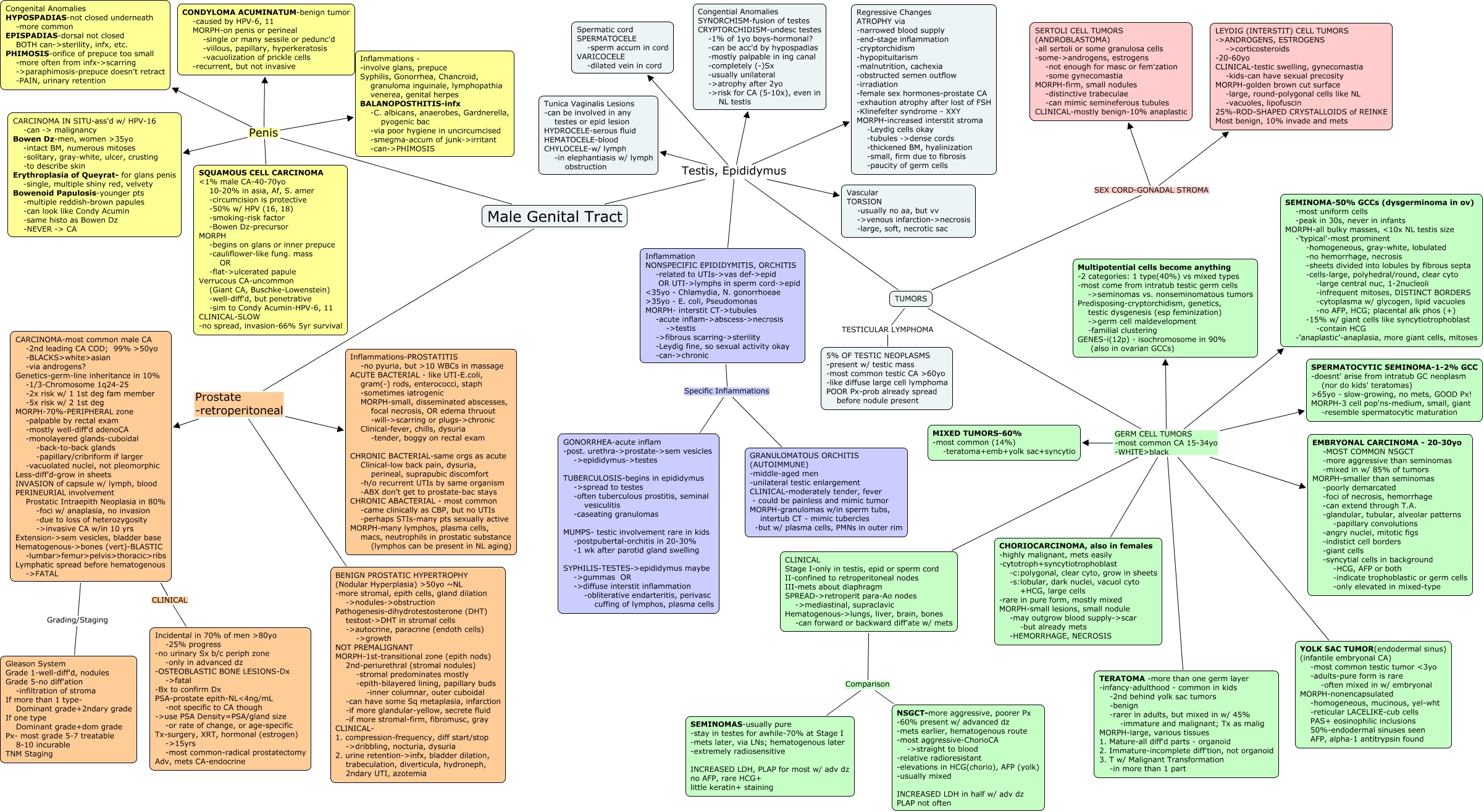 This Concept Map, created with IHMC CmapTools, has information related to: Male Genital Tract, TUMORS GERM CELL TUMORS -most common CA 15-34yo -WHITE>black YOLK SAC TUMOR(endodermal sinus) (infantile embryonal CA) -most common testic tumor ɛyo -adults-pure form is rare -often mixed in w/ embryonal MORPH-nonencapsulated -homogeneous, mucinous, yel-wht -reticular LACELIKE-cub cells PAS+ eosinophilic inclusions 50%-endodermal sinuses seen AFP, alpha-1 antitrypsin found, Inflammation NONSPECIFIC EPIDIDYMITIS, ORCHITIS -related to UTIs->vas def->epid OR UTI->lymphs in sperm cord->epid នyo - Chlamydia, N. gonorrhoeae ᡛyo - E. coli, Pseudomonas MORPH- interstit CT->tubules -acute inflam->abscess->necrosis ->testis ->fibrous scarring->sterility -Leydig fine, so sexual activity okay -can->chronic Specific Inflammations GRANULOMATOUS ORCHITIS (AUTOIMMUNE) -middle-aged men -unilateral testic enlargement CLINICAL-moderately tender, fever - could be painless and mimic tumor MORPH-granulomas w/in sperm tubs, intertub CT - mimic tubercles -but w/ plasma cells, PMNs in outer rim, Male Genital Tract Prostate -retroperitoneal BENIGN PROSTATIC HYPERTROPHY (Nodular Hyperplasia) ᡪyo ~NL -more stromal, epith cells, gland dilation ->nodules->obstruction Pathogenesis-dihydrotestosterone (DHT) testost->DHT in stromal cells ->autocrine, paracrine (endoth cells) ->growth NOT PREMALIGNANT MORPH-1st-transitional zone (epith nods) 2nd-periurethral (stromal nodules) -stromal predominates mostly -epith-bilayered lining, papillary buds -inner columnar, outer cuboidal -can have some Sq metaplasia, infarction -if more glandular-yellow, secrete fluid -if more stromal-firm, fibromusc, gray CLINICAL- 1. compression-frequency, diff start/stop ->dribbling, nocturia, dysuria 2. urine retention->infx, bladder dilation, trabeculation, diverticula, hydroneph, 2ndary UTI, azotemia, Male Genital Tract Testis, Epididymus Regressive Changes ATROPHY via -narrowed blood supply -end-stage inflammation -cryptorchidism -hypopituitarism -malnutrition, cachexia -obstructed semen outflow -irradiation -female sex hormones-prostate CA -exhaution atrophy after lost of FSH -Klinefelter syndrome - XXY MORPH-increased interstit stroma -Leydig cells okay -tubules ->dense cords -thickened BM, hyalinization -small, firm due to fibrosis -paucity of germ cells, TUMORS GERM CELL TUMORS -most common CA 15-34yo -WHITE>black CHORIOCARCINOMA, also in females -highly malignant, mets easily -cytotroph+syncytiotrophoblast -c:polygonal, clear cyto, grow in sheets -s:lobular, dark nuclei, vacuol cyto +HCG, large cells -rare in pure form, mostly mixed MORPH-small lesions, small nodule -may outgrow blood supply->scar -but already mets -HEMORRHAGE, NECROSIS, Male Genital Tract Penis CARCINOMA IN SITU-ass'd w/ HPV-16 -can -> malignancy Bowen Dz-men, women ᡛyo -intact BM, numerous mitoses -solitary, gray-white, ulcer, crusting -to describe skin Erythroplasia of Queyrat- for glans penis -single, multiple shiny red, velvety Bowenoid Papulosis-younger pts -multiple reddish-brown papules -can look like Condy Acumin -same histo as Bowen Dz -NEVER -> CA, CLINICAL Stage I-only in testis, epid or sperm cord II-confined to retroperitoneal nodes III-mets about diaphragm SPREAD->retroperit para-Ao nodes ->mediastinal, supraclavic Hematogenous->lungs, liver, brain, bones -can forward or backward diff'ate w/ mets Comparison SEMINOMAS-usually pure -stay in testes for awhile-70% at Stage I -mets later, via LNs; hematogenous later -extremely radiosensitive INCREASED LDH, PLAP for most w/ adv dz no AFP, rare HCG+ little keratin+ staining, Male Genital Tract Penis Inflammations - -involve glans, prepuce Syphilis, Gonorrhea, Chancroid, granuloma inguinale, lymphopathia venerea, genital herpes BALANOPOSTHITIS-infx -C. albicans, anaerobes, Gardnerella, pyogenic bac -via poor hygiene in uncircumcised -smegma-accum of junk->irritant -can->PHIMOSIS, Male Genital Tract Testis, Epididymus Tunica Vaginalis Lesions -can be involved in any testes or epid lesion HYDROCELE-serous fluid HEMATOCELE-blood CHYLOCELE-w/ lymph -in elephantiasis w/ lymph obstruction, TUMORS TESTICULAR LYMPHOMA 5% OF TESTIC NEOPLASMS -present w/ testic mass -most common testic CA ᡴyo -like diffuse large cell lymphoma POOR Px-prob already spread before nodule present, Male Genital Tract Testis, Epididymus Inflammation NONSPECIFIC EPIDIDYMITIS, ORCHITIS -related to UTIs->vas def->epid OR UTI->lymphs in sperm cord->epid នyo - Chlamydia, N. gonorrhoeae ᡛyo - E. coli, Pseudomonas MORPH- interstit CT->tubules -acute inflam->abscess->necrosis ->testis ->fibrous scarring->sterility -Leydig fine, so sexual activity okay -can->chronic, CARCINOMA-most common male CA -2nd leading CA COD; 99% ᡪyo -BLACKS>white>asian -via androgens? Genetics-germ-line inheritance in 10% -1/3-Chromosome 1q24-25 -2x risk w/ 1 1st deg fam member -5x risk w/ 2 1st deg MORPH-70%-PERIPHERAL zone -palpable by rectal exam -mostly well-diff'd adenoCA -monolayered glands-cuboidal -back-to-back glands -papillary/cribriform if larger -vacuolated nuclei, not pleomorphic Less-diff'd-grow in sheets INVASION of capsule w/ lymph, blood PERINEURIAL involvement Prostatic Intraepith Neoplasia in 80% -foci w/ anaplasia, no invasion -due to loss of heterozygosity ->invasive CA w/in 10 yrs Extension->sem vesicles, bladder base Hematogenous->bones (vert)-BLASTIC -lumbar>femur>pelvis>thoracic>ribs Lymphatic spread before hematogenous ->FATAL CLINICAL Incidental in 70% of men ᢈyo -25% progress -no urinary Sx b/c periph zone -only in advanced dz -OSTEOBLASTIC BONE LESIONS-Dx ->fatal -Bx to confirm Dx PSA-prostate epith-NLɜng/mL -not specific to CA though ->use PSA Density=PSA/gland size -or rate of change, or age-specific Tx-surgery, XRT, hormonal (estrogen) -ᡇyrs -most common-radical prostatectomy Adv, mets CA-endocrine, Male Genital Tract Prostate -retroperitoneal Inflammations-PROSTATITIS -no pyuria, but ᡂ WBCs in massage ACUTE BACTERIAL - like UTI-E.co