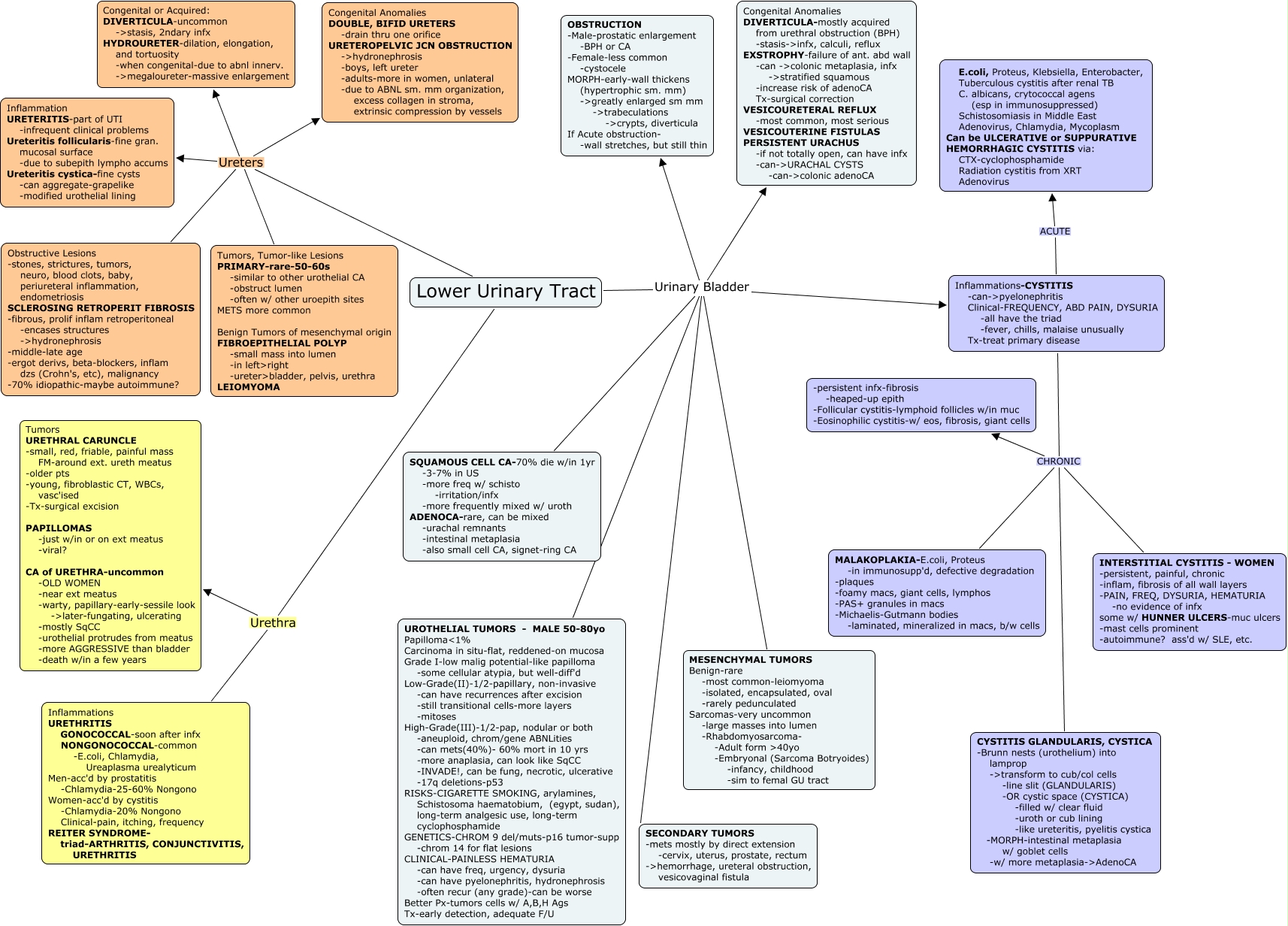 This Concept Map, created with IHMC CmapTools, has information related to: Lower Urinary Tract, Lower Urinary Tract Urinary Bladder Inflammations-CYSTITIS -can->pyelonephritis Clinical-FREQUENCY, ABD PAIN, DYSURIA -all have the triad -fever, chills, malaise unusually Tx-treat primary disease, Lower Urinary Tract Urethra Inflammations URETHRITIS GONOCOCCAL-soon after infx NONGONOCOCCAL-common -E.coli, Chlamydia, Ureaplasma urealyticum Men-acc'd by prostatitis -Chlamydia-25-60% Nongono Women-acc'd by cystitis -Chlamydia-20% Nongono Clinical-pain, itching, frequency REITER SYNDROME- triad-ARTHRITIS, CONJUNCTIVITIS, URETHRITIS, Inflammations-CYSTITIS -can->pyelonephritis Clinical-FREQUENCY, ABD PAIN, DYSURIA -all have the triad -fever, chills, malaise unusually Tx-treat primary disease CHRONIC -persistent infx-fibrosis -heaped-up epith -Follicular cystitis-lymphoid follicles w/in muc -Eosinophilic cystitis-w/ eos, fibrosis, giant cells, Lower Urinary Tract Urinary Bladder MESENCHYMAL TUMORS Benign-rare -most common-leiomyoma -isolated, encapsulated, oval -rarely pedunculated Sarcomas-very uncommon -large masses into lumen -Rhabdomyosarcoma- -Adult form ᡠyo -Embryonal (Sarcoma Botryoides) -infancy, childhood -sim to femal GU tract, Inflammations-CYSTITIS -can->pyelonephritis Clinical-FREQUENCY, ABD PAIN, DYSURIA -all have the triad -fever, chills, malaise unusually Tx-treat primary disease ACUTE E.coli, Proteus, Klebsiella, Enterobacter, Tuberculous cystitis after renal TB C. albicans, crytococcal agens (esp in immunosuppressed) Schistosomiasis in Middle East Adenovirus, Chlamydia, Mycoplasm Can be ULCERATIVE or SUPPURATIVE HEMORRHAGIC CYSTITIS via: CTX-cyclophosphamide Radiation cystitis from XRT Adenovirus, Lower Urinary Tract Urinary Bladder Congenital Anomalies DIVERTICULA-mostly acquired from urethral obstruction (BPH) -stasis->infx, calculi, reflux EXSTROPHY-failure of ant. abd wall -can ->colonic metaplasia, infx ->stratified squamous -increase risk of adenoCA Tx-surgical correction VESICOURETERAL REFLUX -most common, most serious VESICOUTERINE FISTULAS PERSISTENT URACHUS -if not totally open, can have infx -can->URACHAL CYSTS -can->colonic adenoCA, Lower Urinary Tract Urinary Bladder SQUAMOUS CELL CA-70% die w/in 1yr -3-7% in US -more freq w/ schisto -irritation/infx -more frequently mixed w/ uroth ADENOCA-rare, can be mixed -urachal remnants -intestinal metaplasia -also small cell CA, signet-ring CA, Lower Urinary Tract Urinary Bladder UROTHELIAL TUMORS - MALE 50-80yo Papillomaə% Carcinoma in situ-flat, reddened-on mucosa Grade I-low malig potential-like papilloma -some cellular atypia, but well-diff'd Low-Grade(II)-1/2-papillary, non-invasive -can have recurrences after excision -still transitional cells-more layers -mitoses High-Grade(III)-1/2-pap, nodular or both -aneuploid, chrom/gene ABNLities -can mets(40%)- 60% mort in 10 yrs -more anaplasia, can look like SqCC -INVADE!, can be fung, necrotic, ulcerative -17q deletions-p53 RISKS-CIGARETTE SMOKING, arylamines, Schistosoma haematobium, (egypt, sudan), long-term analgesic use, long-term cyclophosphamide GENETICS-CHROM 9 del/muts-p16 tumor-supp -chrom 14 for flat lesions CLINICAL-PAINLESS HEMATURIA -can have freq, urgency, dysuria -can have pyelonephritis, hydronephrosis -often recur (any grade)-can be worse Better Px-tumors cells w/ A,B,H Ags Tx-early detection, adequate F/U, Lower Urinary Tract Urethra Tumors URETHRAL CARUNCLE -small, red, friable, painful mass FM-around ext. ureth meatus -older pts -young, fibroblastic CT, WBCs, vasc'ised -Tx-surgical excision PAPILLOMAS -just w/in or on ext meatus -viral? CA of URETHRA-uncommon -OLD WOMEN -near ext meatus -warty, papillary-early-sessile look ->later-fungating, ulcerating -mostly SqCC -urothelial protrudes from meatus -more AGGRESSIVE than bladder -death w/in a few years, Lower Urinary Tract Ureters Inflammation URETERITIS-part of UTI -infrequent clinical problems Ureteritis follicularis-fine gran. mucosal surface -due to subepith lympho accums Ureteritis cystica-fine cysts -can aggregate-grapelike -modified urothelial lining, Lower Urinary Tract Urinary Bladder SECONDARY TUMORS -mets mostly by direct extension -cervix, uterus, prostate, rectum ->hemorrhage, ureteral obstruction, vesicovaginal fistula, Lower Urinary Tract Urinary Bladder OBSTRUCTION -Male-prostatic enlargement -BPH or CA -Female-less common -cystocele MORPH-early-wall thickens (hypertrophic sm. mm) ->greatly enlarged sm mm ->trabeculations ->crypts, diverticula If Acute obstruction- -wall stretches, but still thin, Lower Urinary Tract Ureters Congenital or Acquired: DIVERTICULA-uncommon ->stasis, 2ndary infx HYDROURETER-dilation, elongation, and tortuosity -when congenital-due to abnl innerv. ->megaloureter-massive enlargement, Lower Urinary Tract Ureters Congenital Anomalies DOUBLE, BIFID URETERS -drain thru one orifice URETEROPELVIC JCN OBSTRUCTION ->hydronephrosis -boys, left ureter -adults-more in women, unlateral -due to ABNL sm. mm organization, excess collagen in stroma, extrinsic compression by vessels, Lower Urinary Tract Ureters Obstructive Lesions -stones, strictures, tumors, neuro, blood clots, baby, periureteral inflammation, endometriosis SCLEROSING RETROPERIT FIBROSIS -fibrous, prolif inflam retroperitoneal -encases structures ->hydronephrosis -middle-late age -ergot derivs, beta-blockers, inflam dzs (Crohn's, etc), malignancy -70% idiopathic-maybe autoimmune?, Lower Urinary Tract Ureters Tumors, Tumor-like Lesions PRIMARY-rare-50-60s -similar to other urothelial CA -obstruct lumen -often w/ other uroepith sites METS more common Benign Tumors of mesenchymal origin FIBROEPITHELIAL POLYP -small mass into lumen -in left>right -ureter>bladder, pelvis, urethra LEIOMYOMA, Inflammations-CYSTITIS -can->pyelonephritis Clinical-FREQUENCY, ABD PAIN, DYSURIA -all have the triad -fever, chills, malaise unusually Tx-treat primary disease CHRONIC CYSTITIS GLANDULARIS, CYSTICA -Brunn nests (urothelium) into l