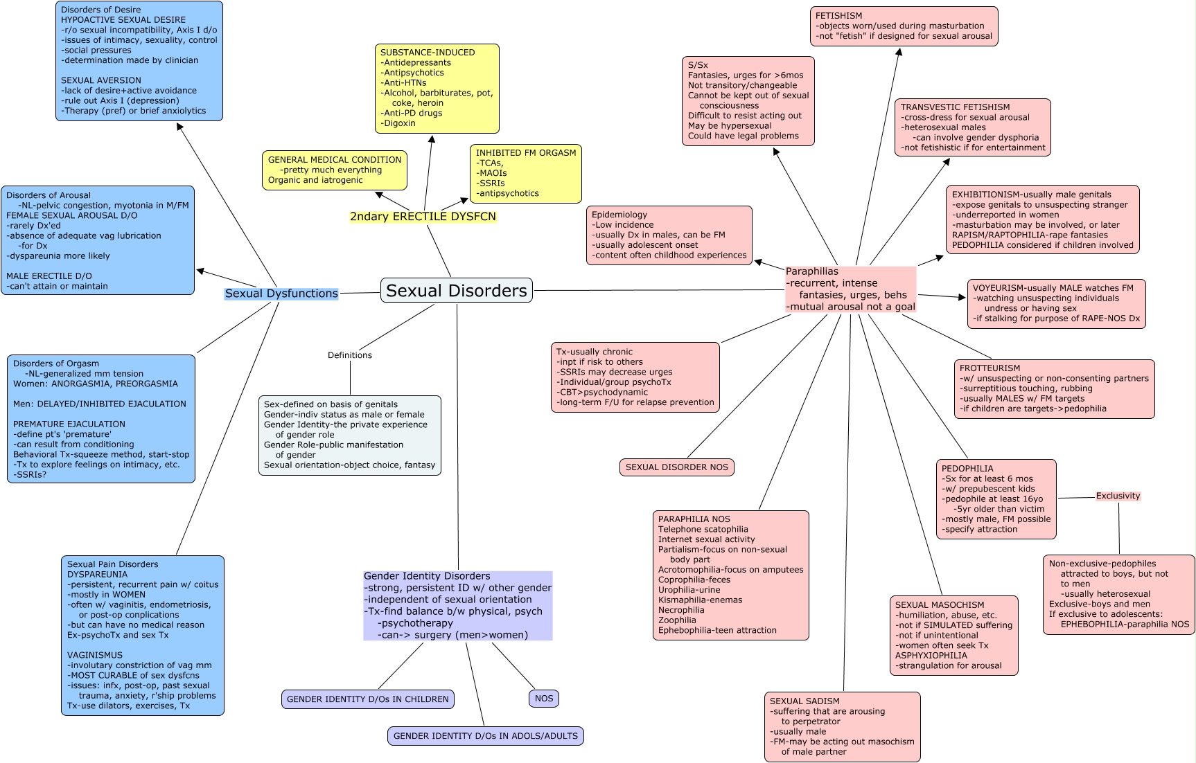 This Concept Map, created with IHMC CmapTools, has information related to: Sexual Disorders, Sexual Disorders Paraphilias -recurrent, intense fantasies, urges, behs -mutual arousal not a goal PARAPHILIA NOS Telephone scatophilia Internet sexual activity Partialism-focus on non-sexual body part Acrotomophilia-focus on amputees Coprophilia-feces Urophilia-urine Kismaphilia-enemas Necrophilia Zoophilia Ephebophilia-teen attraction, Sexual Disorders Paraphilias -recurrent, intense fantasies, urges, behs -mutual arousal not a goal SEXUAL MASOCHISM -humiliation, abuse, etc. -not if SIMULATED suffering -not if unintentional -women often seek Tx ASPHYXIOPHILIA -strangulation for arousal, Sexual Disorders 2ndary ERECTILE DYSFCN SUBSTANCE-INDUCED -Antidepressants -Antipsychotics -Anti-HTNs -Alcohol, barbiturates, pot, coke, heroin -Anti-PD drugs -Digoxin, Sexual Disorders Sexual Dysfunctions Disorders of Desire HYPOACTIVE SEXUAL DESIRE -r/o sexual incompatibility, Axis I d/o -issues of intimacy, sexuality, control -social pressures -determination made by clinician SEXUAL AVERSION -lack of desire+active avoidance -rule out Axis I (depression) -Therapy (pref) or brief anxiolytics, Sexual Disorders Sexual Dysfunctions Sexual Pain Disorders DYSPAREUNIA -persistent, recurrent pain w/ coitus -mostly in WOMEN -often w/ vaginitis, endometriosis, or post-op conplications -but can have no medical reason Ex-psychoTx and sex Tx VAGINISMUS -involutary constriction of vag mm -MOST CURABLE of sex dysfcns -issues: infx, post-op, past sexual trauma, anxiety, r'ship problems Tx-use dilators, exercises, Tx, Sexual Disorders Gender Identity Disorders -strong, persistent ID w/ other gender -independent of sexual orientation -Tx-find balance b/w physical, psych -psychotherapy -can-> surgery (men>women) GENDER IDENTITY D/Os IN ADOLS/ADULTS, PEDOPHILIA -Sx for at least 6 mos -w/ prepubescent kids -pedophile at least 16yo -5yr older than victim -mostly male, FM possible -specify attraction Exclusivity Non-exclusive-pedophiles attracted to boys, but not to men -usually heterosexual Exclusive-boys and men If exclusive to adolescents: EPHEBOPHILIA-paraphilia NOS, Sexual Disorders Gender Identity Disorders -strong, persistent ID w/ other gender -independent of sexual orientation -Tx-find balance b/w physical, psych -psychotherapy -can-> surgery (men>women) GENDER IDENTITY D/Os IN CHILDREN, Sexual Disorders Paraphilias -recurrent, intense fantasies, urges, behs -mutual arousal not a goal Tx-usually chronic -inpt if risk to others -SSRIs may decrease urges -Individual/group psychoTx -CBT>psychodynamic -long-term F/U for relapse prevention, Sexual Disorders Paraphilias -recurrent, intense fantasies, urges, behs -mutual arousal not a goal FETISHISM -objects worn/used during masturbation -not "fetish" if designed for sexual arousal, Sexual Disorders Paraphilias -recurrent, intense fantasies, urges, behs -mutual arousal not a goal PEDOPHILIA -Sx for at least 6 mos -w/ prepubescent kids -pedophile at least 16yo -5yr older than victim -mostly male, FM possible -specify attraction, Sexual Disorders Paraphilias -recurrent, intense fantasies, urges, behs -mutual arousal not a goal VOYEURISM-usually MALE watches FM -watching unsuspecting individuals undress or having sex -if stalking for purpose of RAPE-NOS Dx, Sexual Disorders Paraphilias -recurrent, intense fantasies, urges, behs -mutual arousal not a goal SEXUAL DISORDER NOS, Sexual Disorders Sexual Dysfunctions Disorders of Orgasm -NL-generalized mm tension Women: ANORGASMIA, PREORGASMIA Men: DELAYED/INHIBITED EJACULATION PREMATURE EJACULATION -define pt's 'premature' -can result from conditioning Behavioral Tx-squeeze method, start-stop -Tx to explore feelings on intimacy, etc. -SSRIs?, Sexual Disorders 2ndary ERECTILE DYSFCN INHIBITED FM ORGASM -TCAs, -MAOIs -SSRIs -antipsychotics, Sexual Disorders Definitions Sex-defined on basis of genitals Gender-indiv status as male or female Gender Identity-the private experience of gender role Gender Role-public manifestation of gender Sexual orientation-object choice, fantasy, Sexual Disorders 2ndary ERECTILE DYSFCN GENERAL MEDICAL CONDITION -pretty much everything Organic and iatrogenic, Sexual Disorders Paraphilias -recurrent, intense fantasies, urges, behs -mutual arousal not a goal TRANSVESTIC FETISHISM -cross-dress for sexual arousal -heterosexual males -can involve gender dysphoria -not fetishistic if for entertainment, Sexual Disorders Paraphilias -recurrent, intense fantasies, urges, behs -mutual arousal not a goal S/Sx Fantasies, urges for ɲmos Not transitory/changeable Cannot be kept out of sexual consciousness Difficult to resist acting out May be hypersexual Could have legal problems, Sexual Disorders Sexual Dysfunctions Disorders of Arousal -NL-pelvic congestion, myotonia in M/FM FEMALE SEXUAL AROUSAL D/O -rarely Dx'ed -absence of adequate vag lubrication -for Dx -dyspareunia more likely MALE ERECTILE D/O -can't attain or maintain