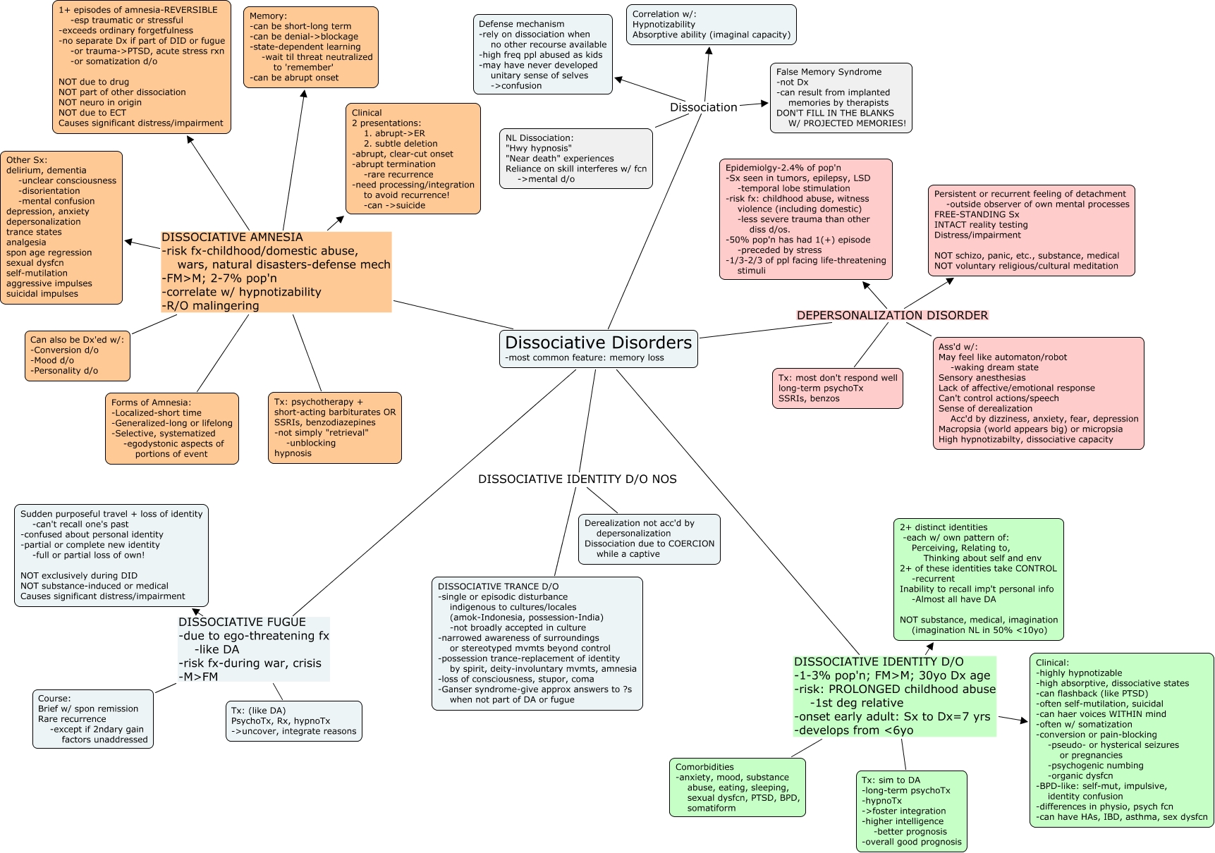 This Concept Map, created with IHMC CmapTools, has information related to: Dissociative Disorders, Dissociative Disorders -most common feature: memory loss DISSOCIATIVE AMNESIA -risk fx-childhood/domestic abuse, wars, natural disasters-defense mech -FM>M; 2-7% pop'n -correlate w/ hypnotizability -R/O malingering Other Sx: delirium, dementia -unclear consciousness -disorientation -mental confusion depression, anxiety depersonalization trance states analgesia spon age regression sexual dysfcn self-mutilation aggressive impulses suicidal impulses, Dissociative Disorders -most common feature: memory loss DISSOCIATIVE AMNESIA -risk fx-childhood/domestic abuse, wars, natural disasters-defense mech -FM>M; 2-7% pop'n -correlate w/ hypnotizability -R/O malingering Clinical 2 presentations: 1. abrupt->ER 2. subtle deletion -abrupt, clear-cut onset -abrupt termination -rare recurrence -need processing/integration to avoid recurrence! -can ->suicide, Dissociative Disorders -most common feature: memory loss DISSOCIATIVE AMNESIA -risk fx-childhood/domestic abuse, wars, natural disasters-defense mech -FM>M; 2-7% pop'n -correlate w/ hypnotizability -R/O malingering Can also be Dx'ed w/: -Conversion d/o -Mood d/o -Personality d/o, Dissociative Disorders -most common feature: memory loss DEPERSONALIZATION DISORDER Epidemiolgy-2.4% of pop'n -Sx seen in tumors, epilepsy, LSD -temporal lobe stimulation -risk fx: childhood abuse, witness violence (including domestic) -less severe trauma than other diss d/os. -50% pop'n has had 1(+) episode -preceded by stress -1/3-2/3 of ppl facing life-threatening stimuli, Dissociative Disorders -most common feature: memory loss DISSOCIATIVE AMNESIA -risk fx-childhood/domestic abuse, wars, natural disasters-defense mech -FM>M; 2-7% pop'n -correlate w/ hypnotizability -R/O malingering Memory: -can be short-long term -can be denial->blockage -state-dependent learning -wait til threat neutralized to 'remember' -can be abrupt onset, Dissociative Disorders -most common feature: memory loss Dissociation NL Dissociation: "Hwy hypnosis" "Near death" experiences Reliance on skill interferes w/ fcn ->mental d/o, Dissociative Disorders -most common feature: memory loss DISSOCIATIVE AMNESIA -risk fx-childhood/domestic abuse, wars, natural disasters-defense mech -FM>M; 2-7% pop'n -correlate w/ hypnotizability -R/O malingering Tx: psychotherapy + short-acting barbiturates OR SSRIs, benzodiazepines -not simply "retrieval" -unblocking hypnosis, Dissociative Disorders -most common feature: memory loss DISSOCIATIVE FUGUE -due to ego-threatening fx -like DA -risk fx-during war, crisis -M>FM Tx: (like DA) PsychoTx, Rx, hypnoTx ->uncover, integrate reasons, Dissociative Disorders -most common feature: memory loss DEPERSONALIZATION DISORDER Persistent or recurrent feeling of detachment -outside observer of own mental processes FREE-STANDING Sx INTACT reality testing Distress/impairment NOT schizo, panic, etc., substance, medical NOT voluntary religious/cultural meditation, Dissociative Disorders -most common feature: memory loss Dissociation Correlation w/: Hypnotizability Absorptive ability (imaginal capacity), Dissociative Disorders -most common feature: memory loss DISSOCIATIVE IDENTITY D/O NOS Derealization not acc'd by depersonalization Dissociation due to COERCION while a captive, Dissociative Disorders -most common feature: memory loss DISSOCIATIVE IDENTITY D/O -1-3% pop'n; FM>M; 30yo Dx age -risk: PROLONGED childhood abuse -1st deg relative -onset early adult: Sx to Dx=7 yrs -develops from ɞyo Tx: sim to DA -long-term psychoTx -hypnoTx ->foster integration -higher intelligence -better prognosis -overall good prognosis, Dissociative Disorders -most common feature: memory loss DISSOCIATIVE IDENTITY D/O NOS DISSOCIATIVE TRANCE D/O -single or episodic disturbance indigenous to cultures/locales (amok-Indonesia, possession-India) -not broadly accepted in culture -narrowed awareness of surroundings or stereotyped mvmts beyond control -possession trance-replacement of identity by spirit, deity-involuntary mvmts, amnesia -loss of consciousness, stupor, coma -Ganser syndrome-give approx answers to ?s when not part of DA or fugue, Dissociative Disorders -most common feature: memory loss DEPERSONALIZATION DISORDER Tx: most don't respond well long-term psychoTx SSRIs, benzos, Dissociative Disorders -most common feature: memory loss Dissociation Defense mechanism -rely on dissociation when no other recourse available -high freq ppl abused as kids -may have never developed unitary sense of selves ->confusion, Dissociative Disorders -most common feature: memory loss DISSOCIATIVE IDENTITY D/O -1-3% pop'n; FM>M; 30yo Dx age -risk: PROLONGED childhood abuse -1st deg relative -onset early adult: Sx to Dx=7 yrs -develops from ɞyo 2+ distinct identities -each w/ own pattern of: Perceiving, Relating to, Thinking about self and env 2+ of these identities take CONTROL -recurrent Inability to recall imp't personal info -Almost all have DA NOT substance, medical, imagination (imagination NL in 50% yo), Dissociative Disorders -most common feature: memory loss DEPERSONALIZATION DISORDER Ass'd w/: May feel like automaton/robot -waking dream state Sensory anesthesias Lack of affective/emotional response Can't control actions/speech Sense of derealization Acc'd by dizziness, anxiety, fear, depression Macropsia (world appears big) or micropsia High hypnotizabilty, dissociative capacity, Dissociative Disorders -most common feature: memory loss DISSOCIATIVE IDENTITY D/O -1-3% pop'n; FM>M; 30yo Dx age -risk: PROLONGED childhood abuse -1st deg relative -onset early adult: Sx to Dx=7 yrs -develops from ɞyo Clinical: -highly hypnotizable -high absorptive, dissociative states -can flashback (like PTSD) -often self-mutilation, suicidal -can haer voices WITHIN mind -often w/ somatization -conversion or pain-blocking -pseudo- or hysterical seizures or pregnancies -psychogenic numbing -organic dysfcn -BPD-like: self-mut, impulsi