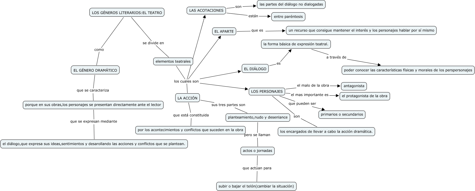 Este mapa conceptual tiene información relacionada a: pepa-lengua-el teatro, planteamiento,nudo y desenlance pero se llaman actos o jornadas, LA ACCIÓN que está constituida por los acontecimientos y conflictos que suceden en la obra, elementos teatrales los cuales son LAS ACOTACIONES, porque en sus obras,los personajes se presentan directamente ante el lector que se expresan mediante el diálogo,que expresa sus ideas,sentimientos y desarollando las acciones y conflictos que se plantean., LOS GÉNEROS LITERARIOS:EL TEATRO como EL GÉNERO DRAMÁTICO, la forma básica de expresión teatral. a través de poder conocer las características físicas y morales de los perspersonajes, LOS PERSONAJES el malo de la obra antagonista, elementos teatrales los cuales son EL DIÁLOGO, EL APARTE que es un recurso que consigue mantener el interés y los personajes hablar por sí mismo, LOS PERSONAJES que pueden ser primarios o secundarios