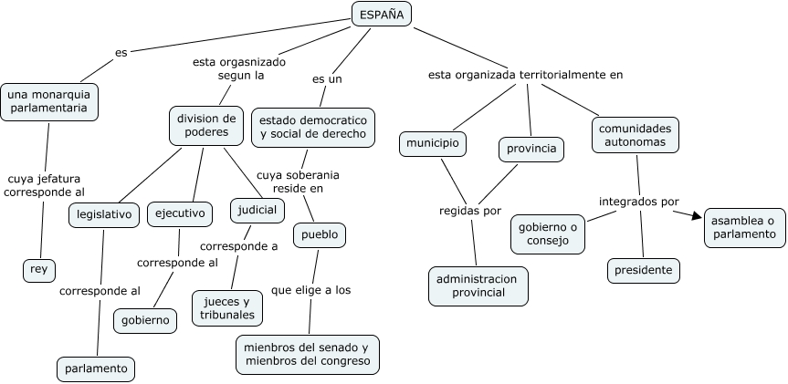 Este mapa conceptual tiene información relacionada a: alba 3a tema 11, ESPAÑA esta orgasnizado segun la division de poderes, ESPAÑA es un estado democratico y social de derecho, comunidades autonomas integrados por asamblea o parlamento, municipio regidas por administracion provincial, ESPAÑA esta organizada territorialmente en provincia, provincia regidas por administracion provincial, ESPAÑA esta organizada territorialmente en municipio, division de poderes ???? judicial, estado democratico y social de derecho cuya soberania reside en pueblo, judicial corresponde a jueces y tribunales