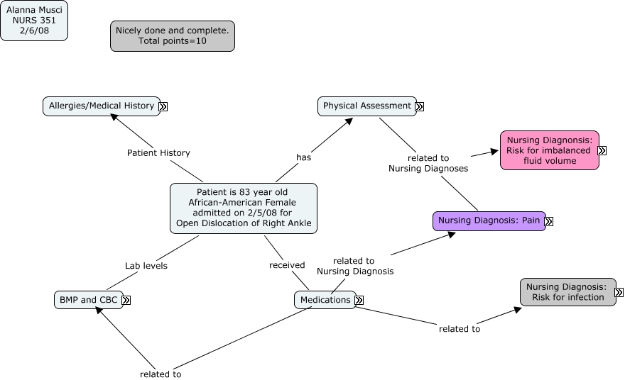 This Concept Map, created with IHMC CmapTools, has information related to: Acute Care 2.6.08, Patient will remain free of infection and demonstrate techniques to reduce risk. Interventions Monitor vital signs q shift, looking for increase in temp initially, Assess skin around dressing for signs of infection: warmth, color outcome Skin assessent within normal limits. No signs of infection., Assessment Vital Signs Temp:37.1 C Pulse: 60 Resp: 20 B/P: 118/66 O2: 98%/NC Pain: 4-5/10 R ankle (4 mg morphine at 1245), Assessment G/I Bowel Sounds present x 4 quad Awaiting BM since surgery, abdomen soft, non-distended, Assess for edema. outcome No edema BUE and none noted on Left foot; Right foot wrapped in cast unable to assess, but patient was able to wiggle toes and cap refill was brisk, Monitor vital signs per shift outcome Patient vital signs stayed witin normal limits, Review labs to monitor changes in elecrtolytes outcome Patient BMP within normal limits except increased K, increased Glucose, increased Cr - (could be related to decreased urine output) Patient CBC showed decreased Hct and Hgb, Cefazolin IVPB 2g in 50ml D5 q8h at 2100 administer to Prevent infection after surgery of Right ankle, Reposition patient q2h to promote comfort and relieve pressure interventions Administered 10mg oxycodone/650 mg acetaminophen at 1800 because patient IV had been discontinued and unable to give Morphine IV, Offer patient fluids qhour outcome Patient intake was adequate, but I could have offered more, Patient will remain free of infection and demonstrate techniques to reduce risk. Interventions Administer antibiotic cefazolin prophylactic per order, checking dose, route, time of drug, Pain related to right ankle internal fixation as evidenced by patient verbalization of 5-7/10 pain throughout shift. Expected Outcome Patient will verbalize decrease in pain to acceptable level below 4/10., Cefazolin IVPB 2g in 50ml D5 q8h at 2100 related to Nursing Diagnosis: Risk for infection, Reassess pain level 30min-1h after medication administered outcome Patient pain increased to a 7/10 after 1900., Held/DC Medications related to High levels of: Potassium Creatinine Glucose, Physical Assessment related to Nursing Diagnoses Nursing Diagnosis: Pain, Assessment Cardiac Apical Pulse regular Radial pulse +2 Bil Femoral pulse +2 Bil Dorsalis Pedis +2 Left Post Tibia +2 Left Cast on Right lower leg/ankle Cap refill brisk Warm temperature no numbness or tingling, Administer antibiotic cefazolin prophylactic per order, checking dose, route, time of drug outcome Med given as ordered Patient tolerated med and showed no signs of infection, Monitor output q shift outcome Patient had decreased outputfor shift in relation to input., Administered 10mg oxycodone/650 mg acetaminophen at 1800 because patient IV had been discontinued and unable to give Morphine IV outcome Patient reported initial decrease to 4/10 pain