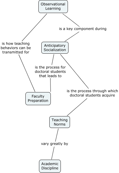This Concept Map, created with IHMC CmapTools, has information related to: Dissertation, Observational Learning is a key component during Anticipatory Socialization, Teaching Norms vary greatly by Academic Discipline, Anticipatory Socialization is the process for doctoral students that leads to Faculty Preparation, Observational Learning is how teaching behaviors can be transmitted for Faculty Preparation, Anticipatory Socialization is the process through which doctoral students acquire Teaching Norms