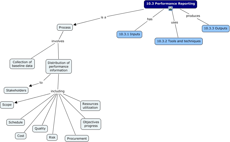 This Concept Map, created with IHMC CmapTools, has information related to: 10.3 Performance Reporting, Distribution of performance information including Schedule, Distribution of performance information including Procurement, 10.3 Performance Reporting is a Process, Process involves Distribution of performance information, 10.3 Performance Reporting uses 10.3.2 Tools and techniques, 10.3 Performance Reporting has 10.3.1 Inputs, 10.3 Performance Reporting produces 10.3.3 Outputs, Process involves Collection of baseline data, Distribution of performance information including Objectives progress, Distribution of performance information including Cost, Distribution of performance information including Risk, Distribution of performance information to Stakeholders, Distribution of performance information including Quality, Distribution of performance information including Resources utilization, Distribution of performance information including Scope
