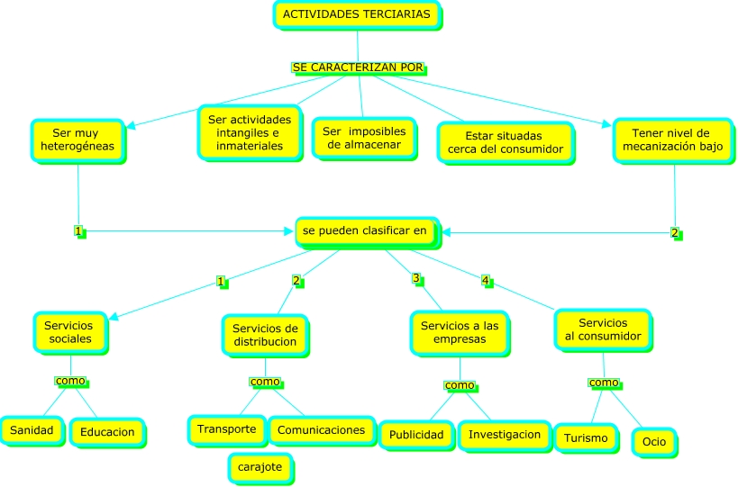 Este mapa conceptual tiene información relacionada a: fontao, ACTIVIDADES TERCIARIAS SE CARACTERIZAN POR Tener nivel de mecanización bajo, ACTIVIDADES TERCIARIAS SE CARACTERIZAN POR Ser actividades intangiles e inmateriales, Servicios a las empresas como Publicidad, se pueden clasificar en 3 Servicios a las empresas, Servicios sociales como Educacion, se pueden clasificar en 1 Servicios sociales, Servicios al consumidor como Ocio, ACTIVIDADES TERCIARIAS SE CARACTERIZAN POR Ser muy heterogéneas, ACTIVIDADES TERCIARIAS SE CARACTERIZAN POR Ser imposibles de almacenar, Ser muy heterogéneas 1 se pueden clasificar en