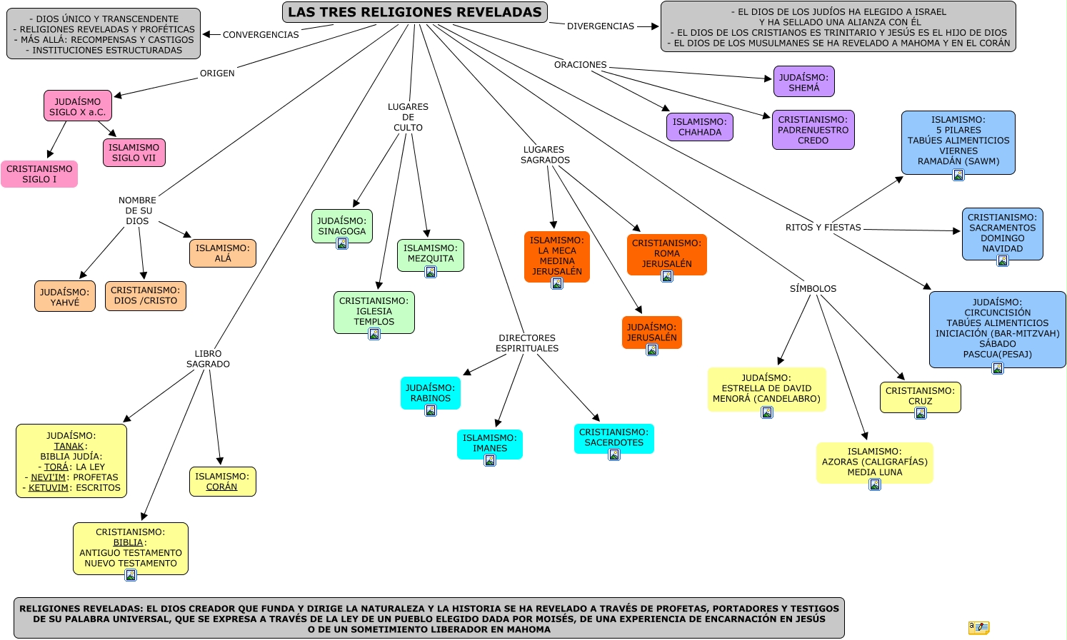 Este Cmap, tiene información relacionada con: Las Religiones Reveladas. Colegio Aljarafe, LAS TRES RELIGIONES REVELADAS LUGARES DE CULTO ISLAMISMO: MEZQUITA, LAS TRES RELIGIONES REVELADAS LUGARES DE CULTO JUDAÍSMO: SINAGOGA, LAS TRES RELIGIONES REVELADAS ORACIONES JUDAÍSMO: SHEMÁ, LAS TRES RELIGIONES REVELADAS SÍMBOLOS ISLAMISMO: AZORAS (CALIGRAFÍAS) MEDIA LUNA, LAS TRES RELIGIONES REVELADAS LUGARES SAGRADOS ISLAMISMO: LA MECA MEDINA JERUSALÉN, LAS TRES RELIGIONES REVELADAS DIRECTORES ESPIRITUALES CRISTIANISMO: SACERDOTES, JUDAÍSMO SIGLO X a.C. ???? ISLAMISMO SIGLO VII, LAS TRES RELIGIONES REVELADAS LUGARES DE CULTO CRISTIANISMO: IGLESIA TEMPLOS, LAS TRES RELIGIONES REVELADAS NOMBRE DE SU DIOS JUDAÍSMO: YAHVÉ, LAS TRES RELIGIONES REVELADAS LUGARES SAGRADOS CRISTIANISMO: ROMA JERUSALÉN, LAS TRES RELIGIONES REVELADAS LIBRO SAGRADO ISLAMISMO: CORÁN, LAS TRES RELIGIONES REVELADAS SÍMBOLOS CRISTIANISMO: CRUZ, LAS TRES RELIGIONES REVELADAS DIRECTORES ESPIRITUALES JUDAÍSMO: RABINOS, LAS TRES RELIGIONES REVELADAS DIVERGENCIAS - EL DIOS DE LOS JUDÍOS HA ELEGIDO A ISRAEL Y HA SELLADO UNA ALIANZA CON ÉL - EL DIOS DE LOS CRISTIANOS ES TRINITARIO Y JESÚS ES EL HIJO DE DIOS - EL DIOS DE LOS MUSULMANES SE HA REVELADO A MAHOMA Y EN EL CORÁN, LAS TRES RELIGIONES REVELADAS RITOS Y FIESTAS ISLAMISMO: 5 PILARES TABÚES ALIMENTICIOS VIERNES RAMADÁN (SAWM), LAS TRES RELIGIONES REVELADAS ORACIONES ISLAMISMO: CHAHADA, LAS TRES RELIGIONES REVELADAS LIBRO SAGRADO JUDAÍSMO: TANAK: BIBLIA JUDÍA: - TORÁ: LA LEY - NEVI'IM: PROFETAS - KETUVIM: ESCRITOS, LAS TRES RELIGIONES REVELADAS LIBRO SAGRADO CRISTIANISMO: BIBLIA: ANTIGUO TESTAMENTO NUEVO TESTAMENTO, LAS TRES RELIGIONES REVELADAS RITOS Y FIESTAS CRISTIANISMO: SACRAMENTOS DOMINGO NAVIDAD, JUDAÍSMO SIGLO X a.C. ???? CRISTIANISMO SIGLO I