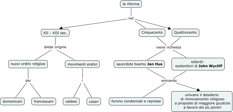 Questa Cmap, creata con IHMC CmapTools, contiene informazioni relative a: riforma_1, movimenti eretici i valdesi, la riforma nel XII - XIII sec., XII - XIII sec. diede origine nuovi ordini religiosi, lollardi: sostenitori di John Wycliff entrambi furono condannati e repressi, lollardi: sostenitori di John Wycliff entrambi univano il desiderio di rinnovamento religioso a proposte di maggiore giustizia a favore dei pù poveri, movimenti eretici i catari, nuovi ordini religiosi dei francescani, XII - XIII sec. diede origine movimenti eretici, Quattrocento viene richiesta sacerdote boemo Jan Hus, sacerdote boemo Jan Hus entrambi univano il desiderio di rinnovamento religioso a proposte di maggiore giustizia a favore dei pù poveri, nuovi ordini religiosi dei domenicani, sacerdote boemo Jan Hus entrambi furono condannati e repressi, Cinquecento viene richiesta sacerdote boemo Jan Hus, Cinquecento viene richiesta lollardi: sostenitori di John Wycliff, Quattrocento viene richiesta lollardi: sostenitori di John Wycliff, la riforma nel Cinquecento, la riforma nel Quattrocento