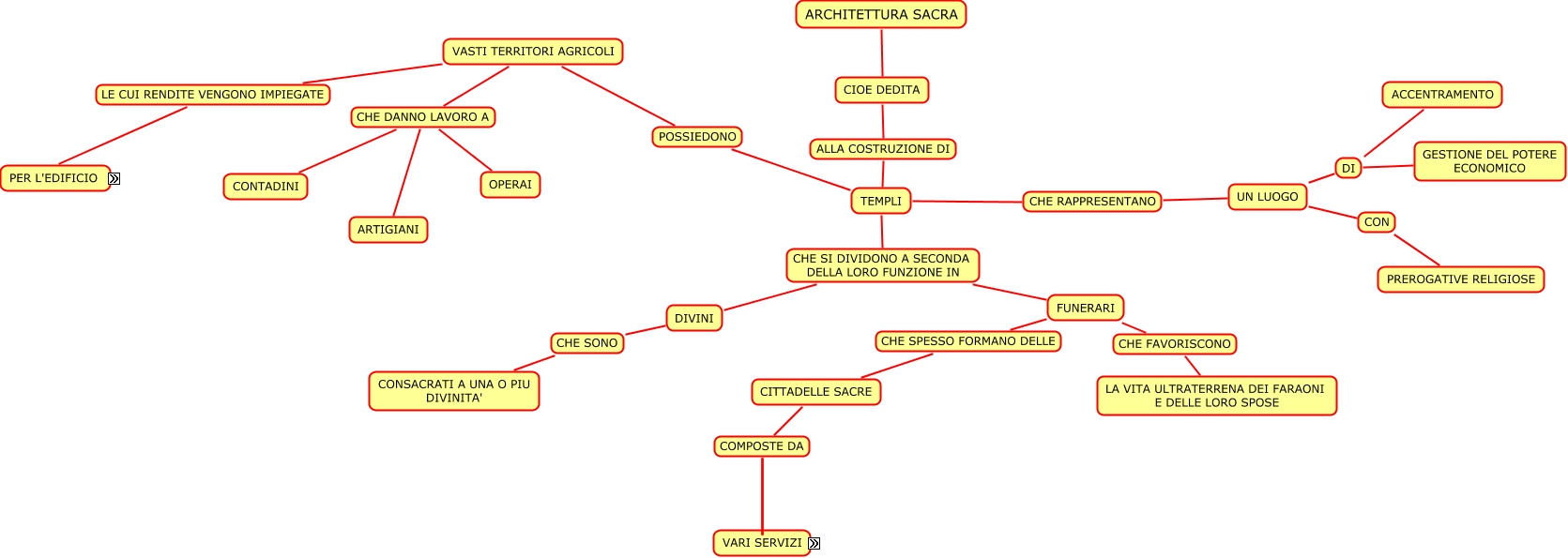 Questa Mappa Concettuale ha informazioni correlate a: TEMPLI intro, CIOE DEDITA ALLA COSTRUZIONE DI TEMPLI, UN LUOGO DI ACCENTRAMENTO, DIVINI CHE SONO CONSACRATI A UNA O PIU DIVINITA', TEMPLI CHE SI DIVIDONO A SECONDA DELLA LORO FUNZIONE IN DIVINI, CITTADELLE SACRE COMPOSTE DA MAGAZZINI, VASTI TERRITORI AGRICOLI CHE DANNO LAVORO A ARTIGIANI, VASTI TERRITORI AGRICOLI LE CUI RENDITE VENGONO IMPIEGATE PER L'EDIFICIO, CITTADELLE SACRE COMPOSTE DA QUARTIERI LAVORATIVI, TEMPLI CHE RAPPRESENTANO UN LUOGO, UN LUOGO CON PREROGATIVE RELIGIOSE, ARCHITETTURA SACRA CIOE DEDITA, TEMPLI CHE SI DIVIDONO A SECONDA DELLA LORO FUNZIONE IN FUNERARI, VASTI TERRITORI AGRICOLI CHE DANNO LAVORO A CONTADINI, UN LUOGO DI GESTIONE DEL POTERE ECONOMICO, FUNERARI CHE SPESSO FORMANO DELLE CITTADELLE SACRE, CITTADELLE SACRE COMPOSTE DA ORTI, VASTI TERRITORI AGRICOLI CHE DANNO LAVORO A OPERAI, TEMPLI POSSIEDONO VASTI TERRITORI AGRICOLI, FUNERARI CHE FAVORISCONO LA VITA ULTRATERRENA DEI FARAONI E DELLE LORO SPOSE