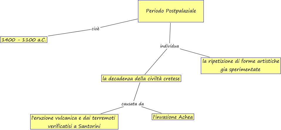Questa Mappa Concettuale ha informazioni correlate a: Postpalaziale, Periodo Postpalaziale individua la decadenza della civiltà cretese, Periodo Postpalaziale cioè 1400 - 1100 a.C., Periodo Postpalaziale individua la ripetizione di forme artistiche gia sperimentate, la decadenza della civiltà cretese causata da l'invasione Achea, la decadenza della civiltà cretese causata da l'eruzione vulcanica e dai terremoti verificatisi a Santorini