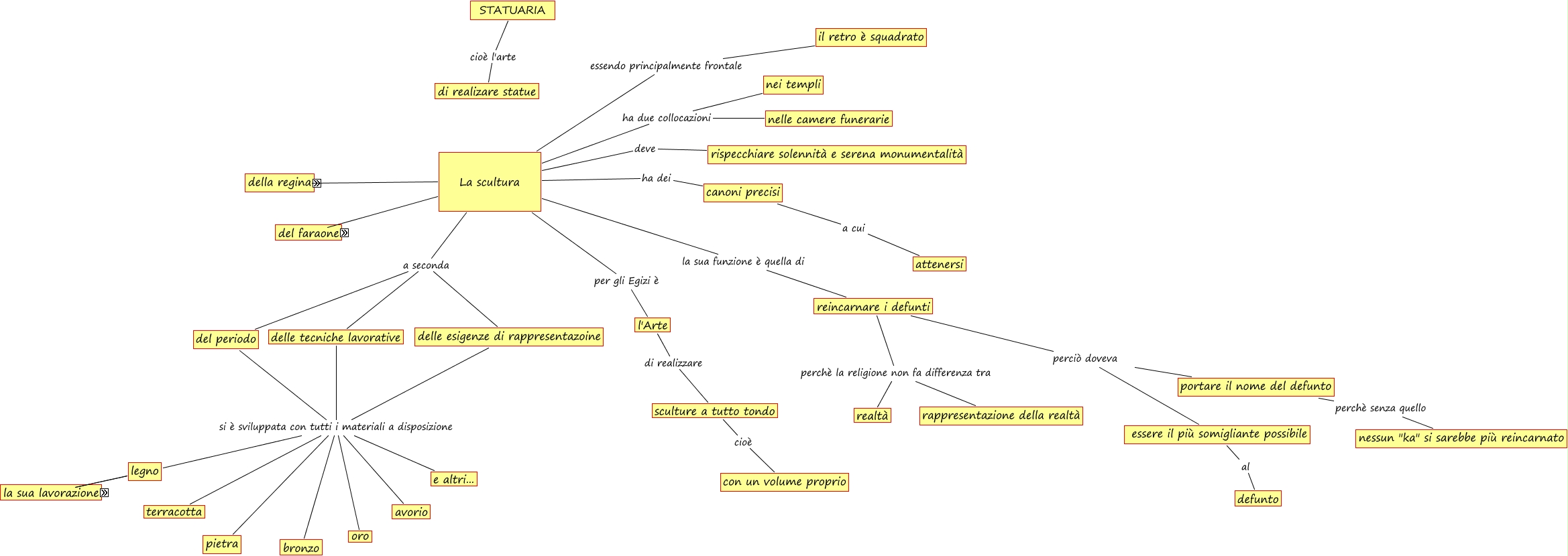 Questa Mappa Concettuale ha informazioni correlate a: SCULTURA, in posizione stante con il capo eretto, reincarnare i defunti perchè la religione non fa differenza tra realtà, reincarnare i defunti perciò doveva portare il nome del defunto, delle tecniche lavorative si è sviluppata con tutti i materiali a disposizione e altri..., in posizione stante con la gamba sinistra avanzata, in posizione stante con le braccia stese lungo i fianchi, La scultura deve rispecchiare solennità e serena monumentalità, delle esigenze di rappresentazoine si è sviluppata con tutti i materiali a disposizione e altri..., liscia tramite l'impiego di lisciatoi, delle esigenze di rappresentazoine si è sviluppata con tutti i materiali a disposizione legno, La scultura ha due collocazioni nelle camere funerarie, di scalpelli di metallo percossi con mazzuoli di legno, legno si ricavava da un unico blocco, Klaft o Nemes, reincarnare i defunti perciò doveva essere il più somigliante possibile, in posizione stante con il possente torso nudo, del periodo si è sviluppata con tutti i materiali a disposizione terracotta, La scultura per gli Egizi è l'Arte, la terza di lucidatura per rendere la superficie liscia, delle esigenze di rappresentazoine si è sviluppata con tutti i materiali a disposizione oro