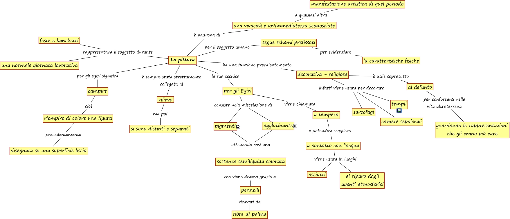 Questa Mappa Concettuale ha informazioni correlate a: Pittura, agglutinante sostanza collosa ottenuta da albume d'uovo, decorativa - religiosa infatti viene usata per decorare camere sepolcrali, La pittura è sempre stata strettamente collegata al rilievo, campire cioè riempire di colore una figura, decorativa - religiosa infatti viene usata per decorare sarcofagi, La pittura rappresentava il soggetto durante feste e banchetti, agglutinante sostanza collosa ottenuta da acqua, La pittura rappresentava il soggetto durante una normale giornata lavorativa, pennelli ricavati da fibre di palma, decorativa - religiosa è utile sopratutto al defunto, La pittura è padrona di una vivacità e un'immediatezza sconosciute, per gli Egizi viene chiamata a tempera, riempire di colore una figura precedentemente disegnata su una superficie liscia, segue schemi prefissati per evidenziare la caratteristiche fisiche, a contatto con l'acqua viene usata in luoghi asciutti, pigmenti ottenendo così una agglutinante, a contatto con l'acqua viene usata in luoghi al riparo dagli agenti atmosferici, La pittura per gli egizi significa campire, decorativa - religiosa infatti viene usata per decorare templi, a tempera e potendosi scogliere a contatto con l'acqua