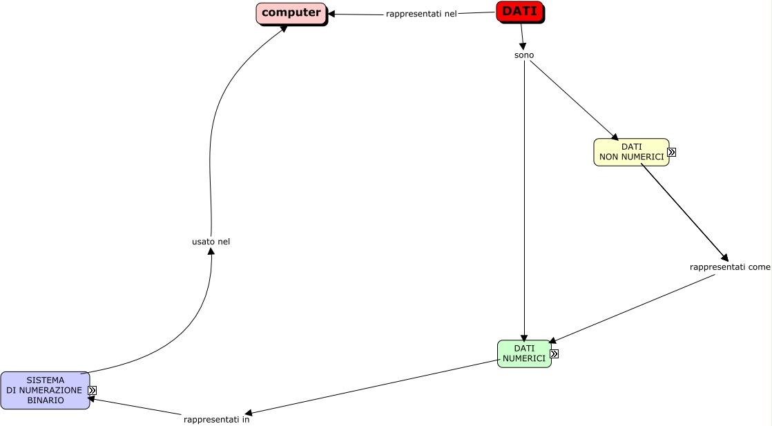 Questa Mappa Concettuale ha informazioni correlate a: RappresentazioneDati, numeri non interi rappresentati in virgola mobile, posizionale può essere ..., posizionale ha base, bit formano byte (8bit), DATI NUMERICI nel computer sono numeri interi (positivi e negativi), audio rappresentati come DATI NUMERICI nel computer, bit formano double (32bit), DATI NUMERICI nel computer elaborati da operazioni aritmetiche, DATI sono DATI NUMERICI nel computer, parole di diversa lunghezza ad esempio double (32bit), DATI NUMERICI nel computer rappresentati in binario, posizionale può essere decimale, algoritmi di conversione ad esempio conversione da base b=2 a base b = 2n, algoritmi di conversione convertono base, DATI NUMERICI nel computer sono numeri non interi, istruzioni rappresentati come DATI NUMERICI nel computer, posizionale può essere ottale, DATI NON NUMERICI nel computer sono caratteri e testi, immagini e video rappresentati come DATI NUMERICI nel computer, parole di diversa lunghezza ad esempio word (16 bit)