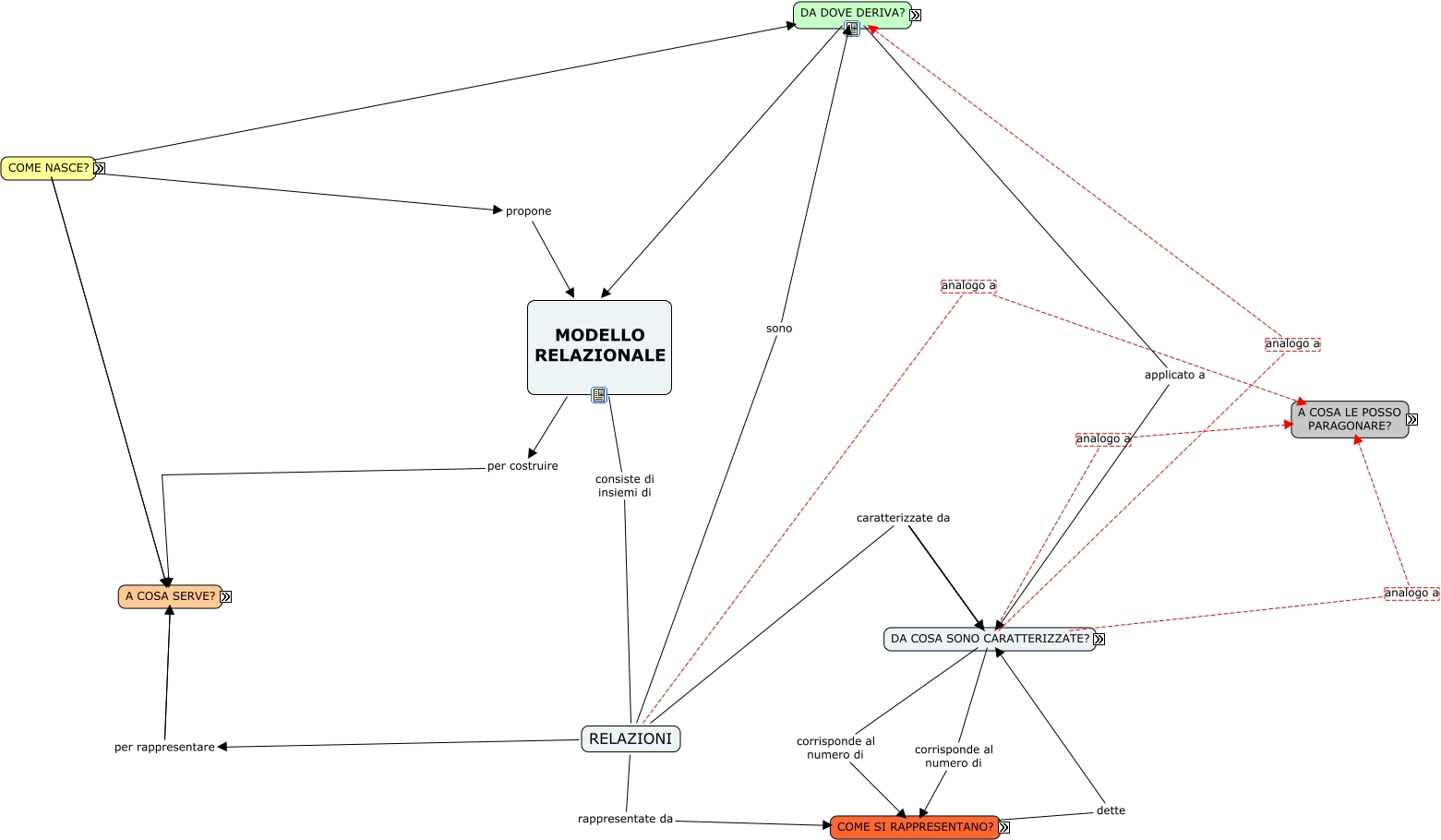 Questa Mappa Concettuale ha informazioni correlate a: Modello Relazionale, RELAZIONI sono SOTTOINSIEME DEL PRODOTTO CARTESIANO, RELAZIONI caratterizzate da TUPLE, MODELLI PRECEDENTI consiste di liste di PUNTATORI, CODD propone MODELLO RELAZIONALE, CODD applicò TEORIA DEGLI INSIEMI, MODELLI PRECEDENTI affetti LIMITAZIONI APPROCCI PRECEDENTI, RETICOLARE e.g. IMS, RELAZIONI caratterizzate da CARDINALITA', PRODOTTO CARTESIANO applicato a DOMINIO, MODELLO RELAZIONALE per costruire MODELLI LOGICI, CARDINALITA' è numero di TUPLE, TEORIA DEGLI INSIEMI definisce OPERAZIONI e RELAZIONI, OPERAZIONI e RELAZIONI come UNIONE, OPERAZIONI e RELAZIONI come INTERSEZIONE, TABELLE caratterizzate da RIGHE, ATTRIBUTO prende valori in DOMINIO, OPERAZIONI e RELAZIONI come PRODOTTO CARTESIANO, SOTTOINSIEME DEL PRODOTTO CARTESIANO incluso in PRODOTTO CARTESIANO, MODELLO RELAZIONALE consiste di insiemi di RELAZIONI, RELAZIONI per rappresentare RELATIONSHIP LOGICHE