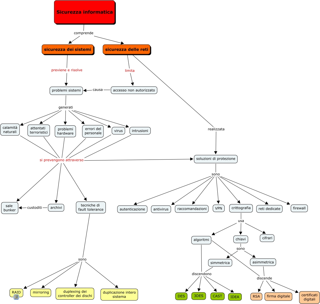 Questa Mappa Concettuale ha informazioni correlate a: Sicurezza Informatica, problemi sistemi generati attentati terroristici, sicurezza delle reti realizzata soluzioni di protezione, chiavi sono simmetrica, errori del personale si prevengono attraverso soluzioni di protezione, algoritmi discendono CAST, asimmetrica discende certificati digitali, errori del personale si prevengono attraverso sale bunker, asimmetrica discende firma digitale, crittografia usa chiavi, problemi hardware si prevengono attraverso archivi, simmetrica discendono IDEA, soluzioni di protezione sono autenticazione, archivi custoditi sale bunker, sicurezza dei sistemi previene e risolve problemi sistemi, problemi hardware si prevengono attraverso sale bunker, accesso non autorizzato causa problemi sistemi, Sicurezza informatica comprende sicurezza delle reti, algoritmi discendono IDEA, calamità naturali si prevengono attraverso soluzioni di protezione, problemi sistemi generati errori del personale