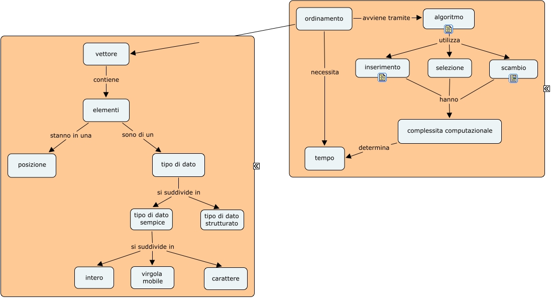 Questa Mappa Concettuale ha informazioni correlate a: vettori_ordinamento, elementi sono di un tipo di dato, complessita computazionale determina tempo, algoritmo utilizza scambio, ordinamento necessita tempo, algoritmo utilizza selezione, tipo di dato sempice si suddivide in carattere, tipo di dato sempice si suddivide in virgola mobile, selezione hanno complessita computazionale, ordinamento ordina vettore, ordinamento avviene tramite algoritmo, vettore contiene elementi, scambio hanno complessita computazionale, tipo di dato si suddivide in tipo di dato sempice, inserimento hanno complessita computazionale, elementi stanno in una posizione, tipo di dato si suddivide in tipo di dato strutturato, algoritmo utilizza inserimento, tipo di dato sempice si suddivide in intero