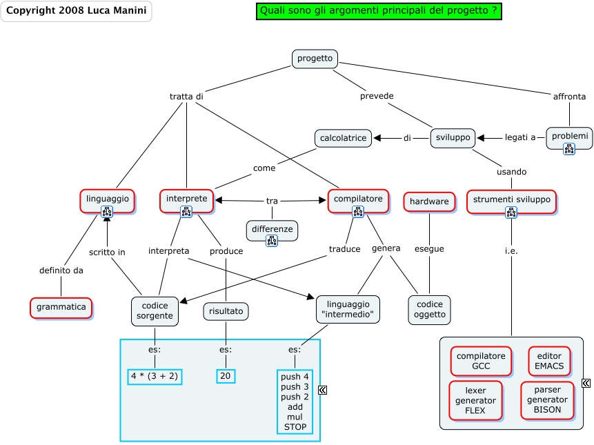 Questa Mappa Concettuale ha informazioni correlate a: ling-int-comp, interprete interpreta linguaggio "intermedio", codice sorgente es: 4 * (3 + 2), hardware esegue codice oggetto, linguaggio "intermedio" es: push 4 push 3 push 2 add mul STOP, progetto tratta di interprete, problemi legati a sviluppo, progetto tratta di compilatore, calcolatrice come interprete, interprete interpreta codice sorgente, sviluppo usando strumenti sviluppo, compilatore traduce codice sorgente, codice sorgente scritto in linguaggio, sviluppo di calcolatrice, differenze tra compilatore, differenze tra interprete, interprete produce risultato, progetto tratta di linguaggio, compilatore genera linguaggio "intermedio", progetto prevede sviluppo, linguaggio definito da grammatica