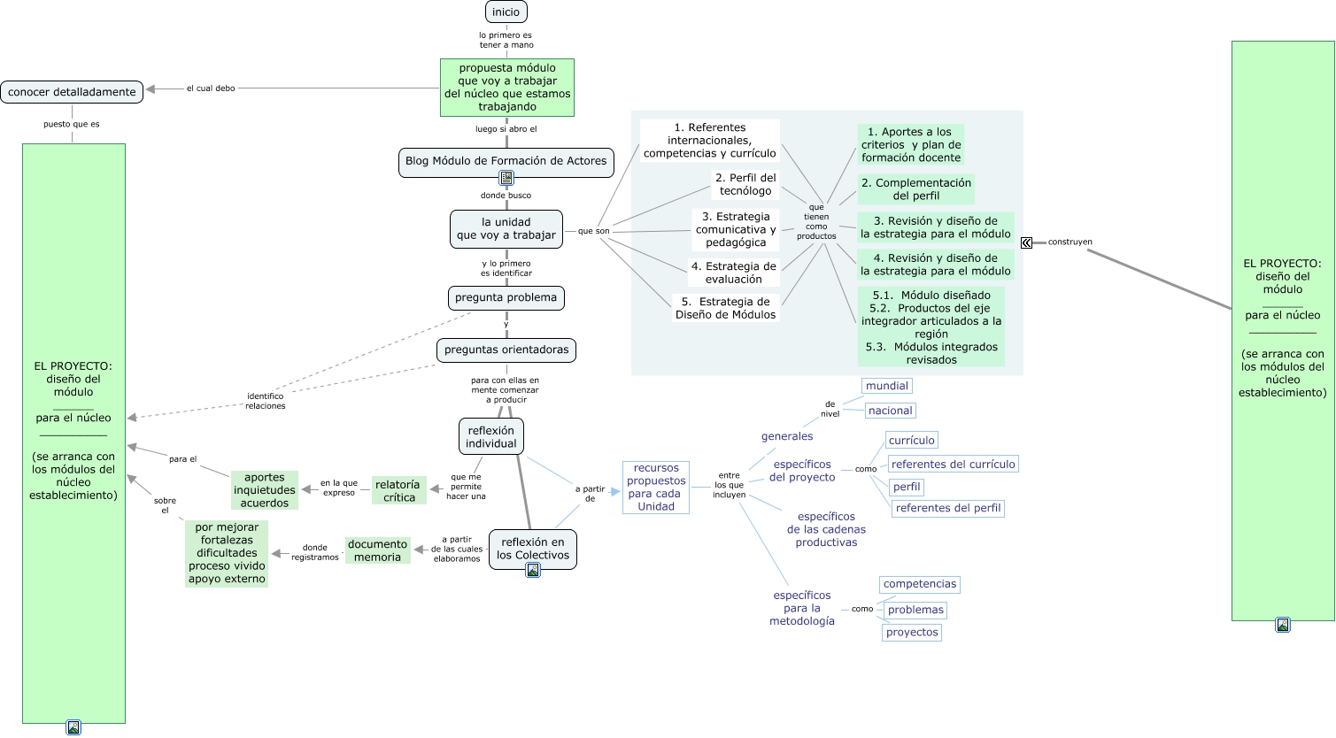 Este mapa conceptual tiene información relacionada a: recorrido del módulo FormAct, pregunta problema identifico relaciones EL PROYECTO: diseño del módulo ______ para el núcleo __________ (se arranca con los módulos del núcleo establecimiento), reflexión individual que me permite hacer una relatoría crítica, preguntas orientadoras para con ellas en mente comenzar a producir reflexión individual, la unidad que voy a trabajar que son 4. Estrategia de evaluación, Blog Módulo de Formación de Actores donde busco la unidad que voy a trabajar, generales de nivel nacional, específicos del proyecto como perfil, 3. Estrategia comunicativa y pedagógica que tienen como productos 2. Complementación del perfil, preguntas orientadoras para con ellas en mente comenzar a producir reflexión en los Colectivos, 5. Estrategia de Diseño de Módulos que tienen como productos 4. Revisión y diseño de la estrategia para el módulo