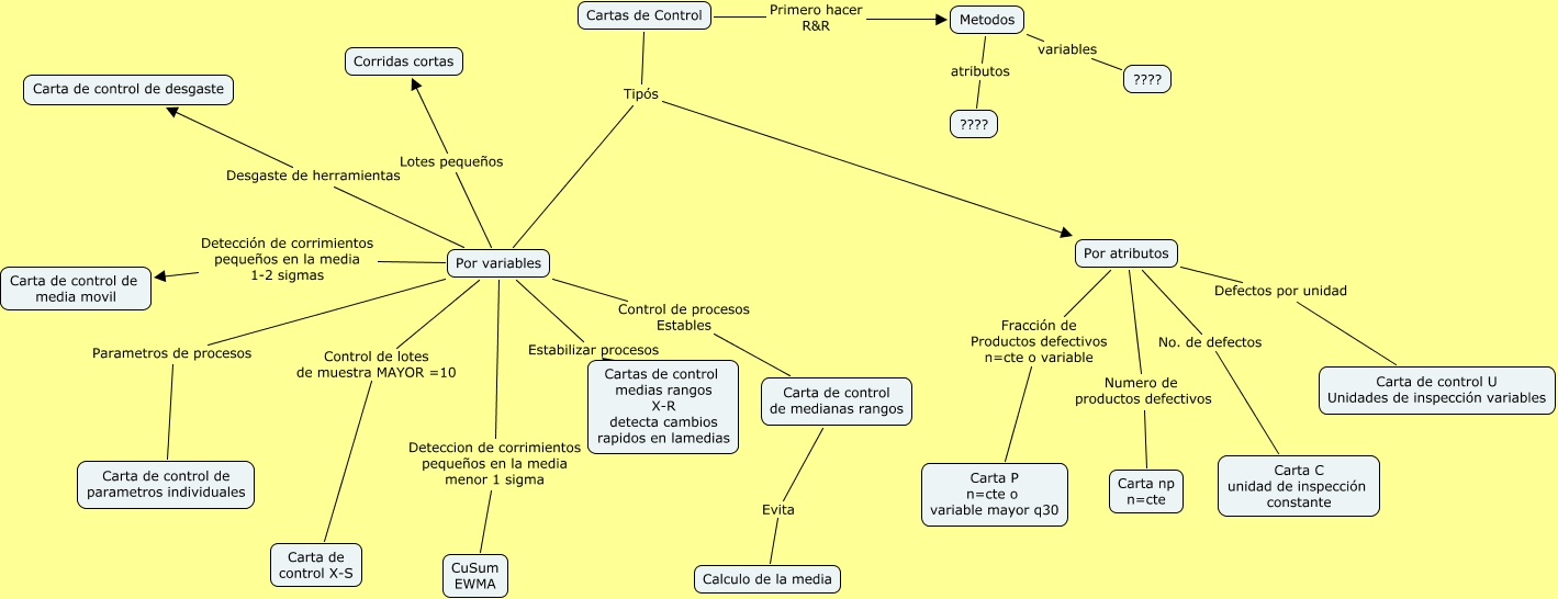 Este Cmap, tiene información relacionada con: Cartas de Control, Cartas de Control Tipós Por variables, Por variables Detección de corrimientos pequeños en la media 1-2 sigmas Carta de control de media movil, Por atributos No. de defectos Carta C unidad de inspección constante, Por variables Lotes pequeños Corridas cortas, Por variables Deteccion de corrimientos pequeños en la media menor 1 sigma CuSum EWMA, Por variables Control de lotes de muestra MAYOR =10 Carta de control X-S, Metodos atributos ????, Por variables Estabilizar procesos Cartas de control medias rangos X-R detecta cambios rapidos en lamedias, Por variables Control de procesos Estables Carta de control de medianas rangos, Cartas de Control Primero hacer R&R Metodos, Por atributos Defectos por unidad Carta de control U Unidades de inspección variables, Por variables Parametros de procesos Carta de control de parametros individuales, Por variables Desgaste de herramientas Carta de control de desgaste, Metodos variables ????, Por atributos Fracción de Productos defectivos n=cte o variable Carta P n=cte o variable mayor q30, Cartas de Control Tipós Por atributos, Por atributos Numero de productos defectivos Carta np n=cte, Carta de control de medianas rangos Evita Calculo de la media