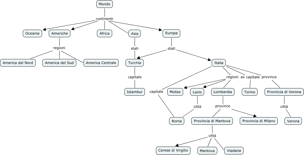 Questa Cmap, creata con IHMC CmapTools, contiene informazioni relative a: esercizio 2, Asia stati Turchia, Provincia di Verona città Verona, Italia regioni Lombardia, Lazio città Roma, Mondo continenti Asia, Italia ex capitale Torino, Provincia di Mantova città Cerese di Virgilio, Italia regioni Molise, Mondo continenti Americhe, Provincia di Mantova città Mantova, Mondo continenti Oceania, Turchia capitale Istambul, Italia province Provincia di Verona, Provincia di Mantova città Viadana, Mondo continenti Europa, Americhe regioni America Centrale, Italia capitale Roma, Italia regioni Lazio, Mondo continenti Africa, Americhe regioni America del Nord