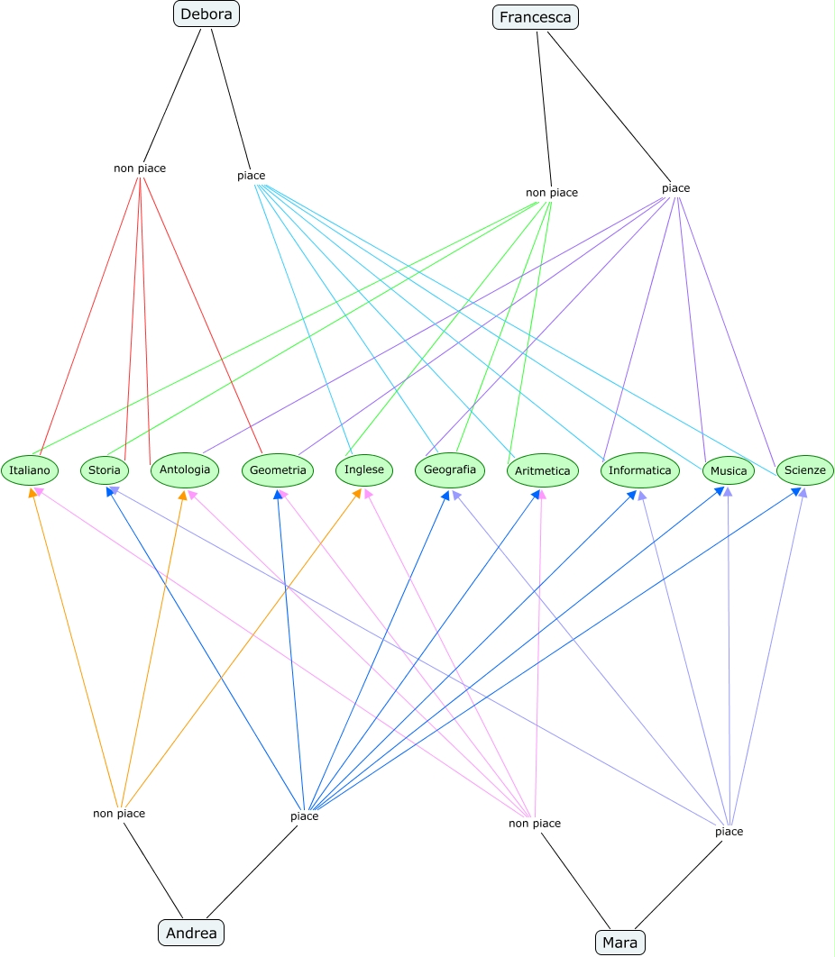 Questa Cmap, creata con IHMC CmapTools, contiene informazioni relative a: esercizio 1, Mara piace Informatica, Andrea piace Geometria, Mara piace Geografia, Mara piace Storia, Andrea non piace Antologia, Andrea piace Aritmetica, Mara non piace Inglese, Andrea piace Storia, Francesca non piace Aritmetica, Francesca piace Geografia, Debora piace Aritmetica, Debora non piace Storia, Mara non piace Italiano, Andrea non piace Italiano, Debora piace Musica, Debora non piace Italiano, Francesca non piace Storia, Mara piace Scienze, Andrea piace Informatica, Debora non piace Geometria