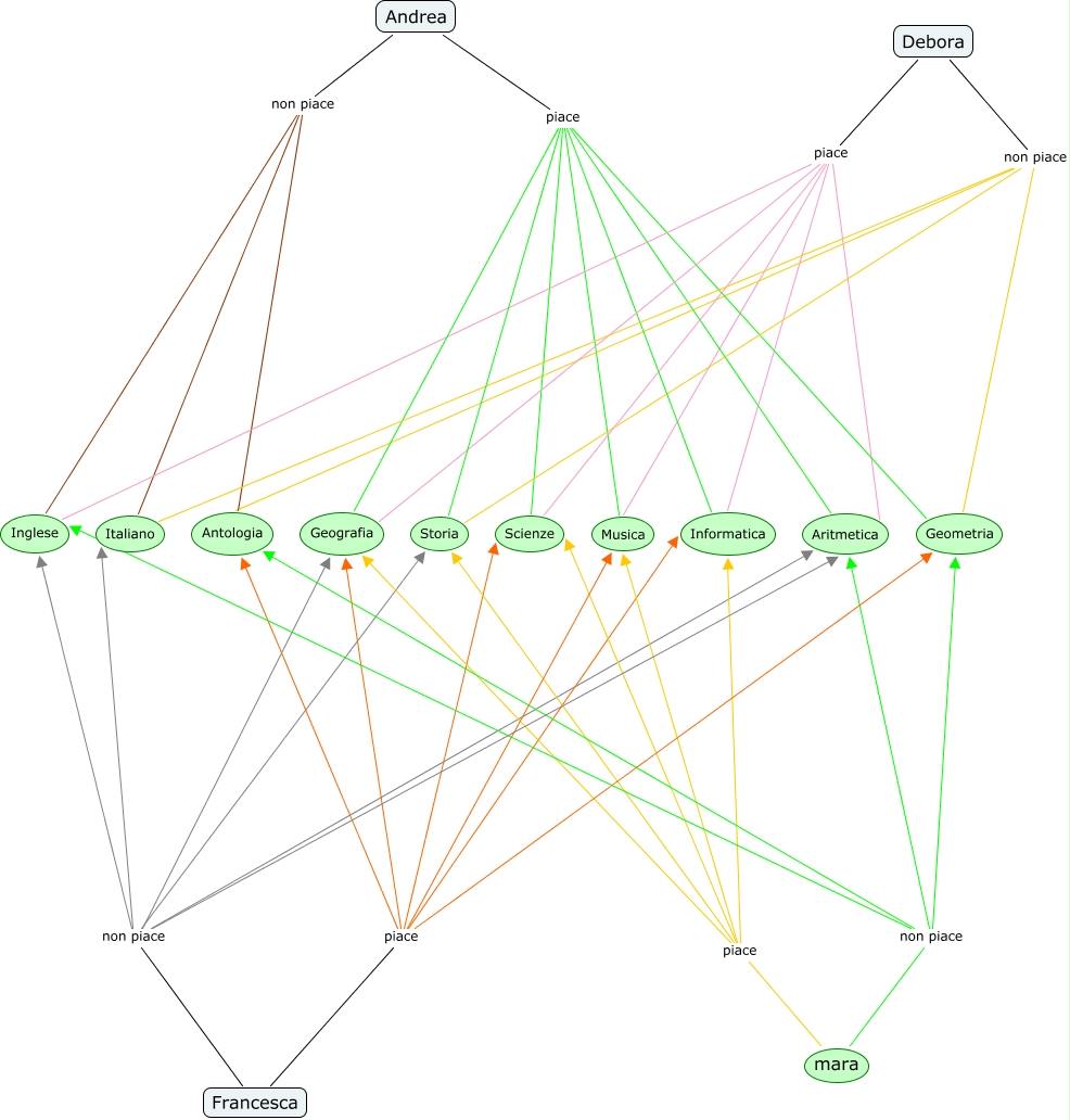 Questa Cmap, creata con IHMC CmapTools, contiene informazioni relative a: esercizio 1, Francesca piace Geografia, Andrea piace Geografia, Francesca piace Musica, mara piace Geografia, Francesca piace Scienze, Debora non piace Geometria, Francesca non piace Aritmetica, Debora non piace Italiano, mara non piace Inglese, Debora piace Scienze, Francesca non piace Italiano, Debora non piace Storia, Francesca piace Antologia, Francesca piace Geometria, Andrea non piace Antologia, Debora piace Aritmetica, Debora non piace Antologia, mara non piace Geometria, Andrea piace Aritmetica, mara piace Informatica