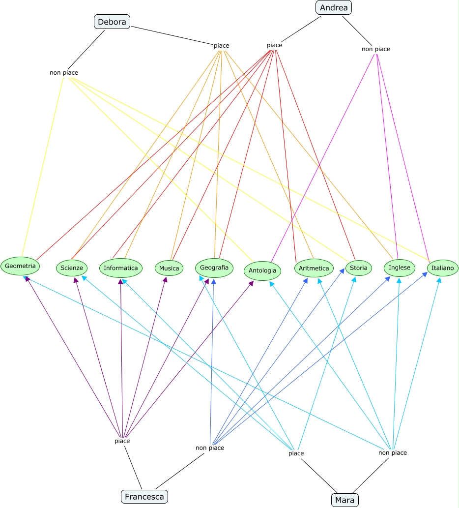 Questa Cmap, creata con IHMC CmapTools, contiene informazioni relative a: esercizio 1, Andrea piace Informatica, Debora piace Aritmetica, Mara non piace Antologia, Andrea piace Storia, Andrea piace Scienze, Debora piace Scienze, Mara non piace Aritmetica, Mara piace Informatica, Mara non piace Italiano, Andrea non piace Antologia, Debora non piace Geometria, Mara piace Storia, Francesca piace Informatica, Debora piace Informatica, Andrea piace Geometria, Francesca piace Antologia, Francesca non piace Geografia, Debora piace Geografia, Andrea non piace Inglese, Francesca non piace Italiano