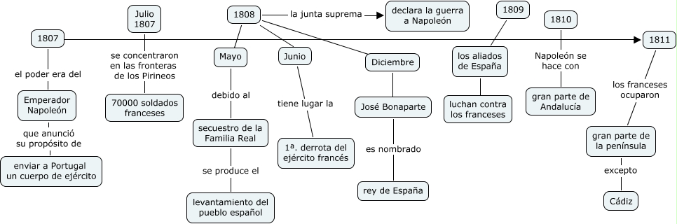 Este mapa conceptual tiene información relacionada a: gema vela-la batalla de chiclana, Junio tiene lugar la 1ª. derrota del ejército francés, 1807 el poder era del Emperador Napoleón, 1811 los franceses ocuparon gran parte de la península, 1808 ???? Mayo, 1808 ???? Junio, José Bonaparte es nombrado rey de España, 1807 ???? 1811, 1808 la junta suprema declara la guerra a Napoleón, 1810 Napoleón se hace con gran parte de Andalucía, Julio 1807 se concentraron en las fronteras de los Pirineos 70000 soldados franceses