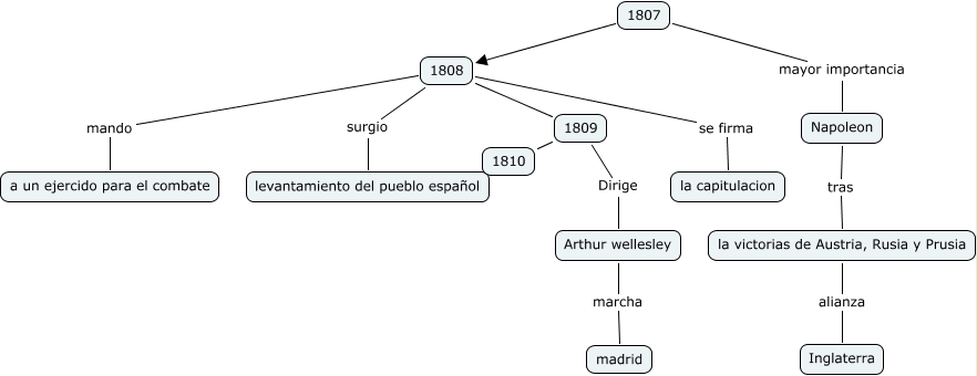Este mapa conceptual tiene información relacionada a: Maria Oliva Lucena, 1808 se firma la capitulacion, 1809 1810, 1809 Dirige Arthur wellesley, 1808 surgio levantamiento del pueblo español, la victorias de Austria, Rusia y Prusia alianza Inglaterra, 1807 1808, 1808 mando a un ejercido para el combate, Napoleon tras la victorias de Austria, Rusia y Prusia, 1808 1809, Arthur wellesley marcha madrid