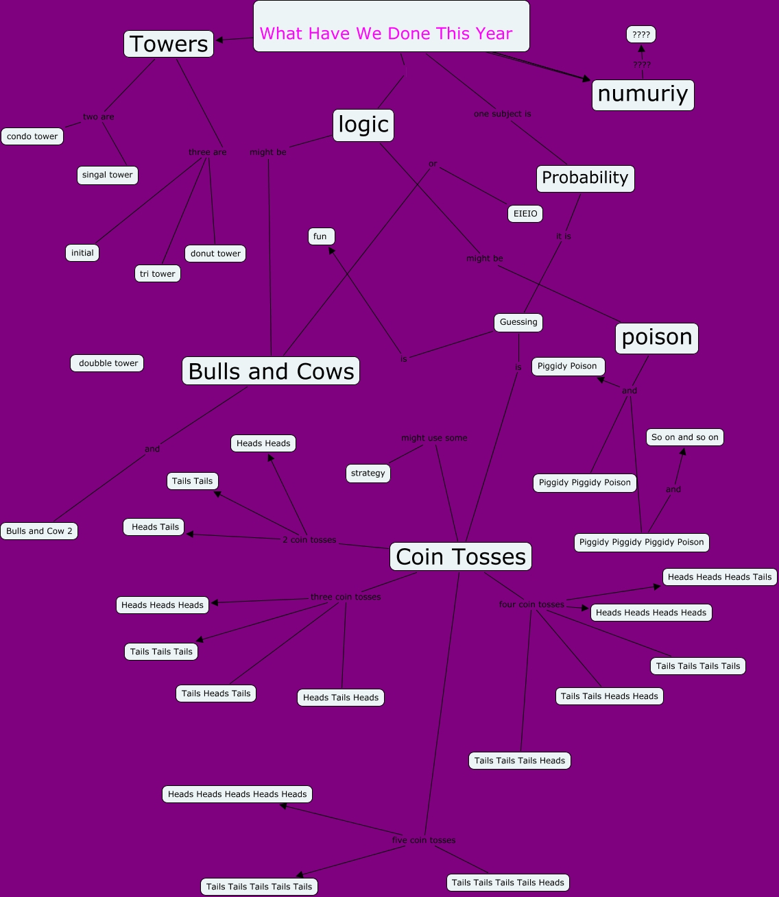 This Concept Map, created with IHMC CmapTools, has information related to: Medium, Coin Tosses three coin tosses Tails Tails Tails, Bulls and Cows or EIEIO, Guessing is fun, strategy might use some Coin Tosses, Coin Tosses three coin tosses Heads Tails Heads, Bulls and Cows and Bulls and Cow 2, initial three are tri tower, poison and Piggidy Piggidy Piggidy Poison, Coin Tosses four coin tosses Tails Tails Heads Heads, Probability it is Guessing, Guessing is Coin Tosses, What Have We Done This Year ???? numuriy, poison and Piggidy Poison, What Have We Done This Year logic, Coin Tosses four coin tosses Heads Heads Heads Heads, condo tower two are singal tower, Towers two are singal tower, Coin Tosses four coin tosses Tails Tails Tails Heads, Towers three are tri tower, numuriy ???? ????