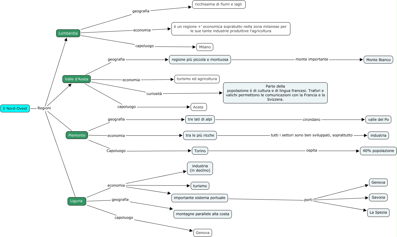 Questa Cmap, creata con IHMC CmapTools, contiene informazioni relative a: Esercizio 4, Liguria economia importante sistema portuale, tre lati di alpi cirondano valle del Po, Liguria capoluogo Genova, Piemonte geografia tre lati di alpi, regione più piccola e montuosa monte importante Monte Bianco, Il Nord-Ovest Regioni Lombardia, importante sistema portuale porti Savona, Torino ospita 40% popolazione, Il Nord-Ovest Regioni Liguria, Valle d'Aosta geografia regione più piccola e montuosa, Piemonte Capoluogo Torino, Lombardia economia è un regione +' economica sopratutto nella zona milanese per le sue tante industrie produttive l'agricoltura, importante sistema portuale porti La Spezia, Lombardia capoluogo Milano, Valle d'Aosta curiosità Parte della popolazione è di cultura e di lingua francesi. Trafori e valichi permettono le comunicazioni con la Francia e la Svizzera., Liguria economia industria (in declino), Liguria geografia montagne parallele alla costa, tra le più ricche tutti i settori sono ben sviluppati, soprattutto industria, Il Nord-Ovest Regioni Piemonte, Lombardia geografia ricchissima di fiumi e lagli