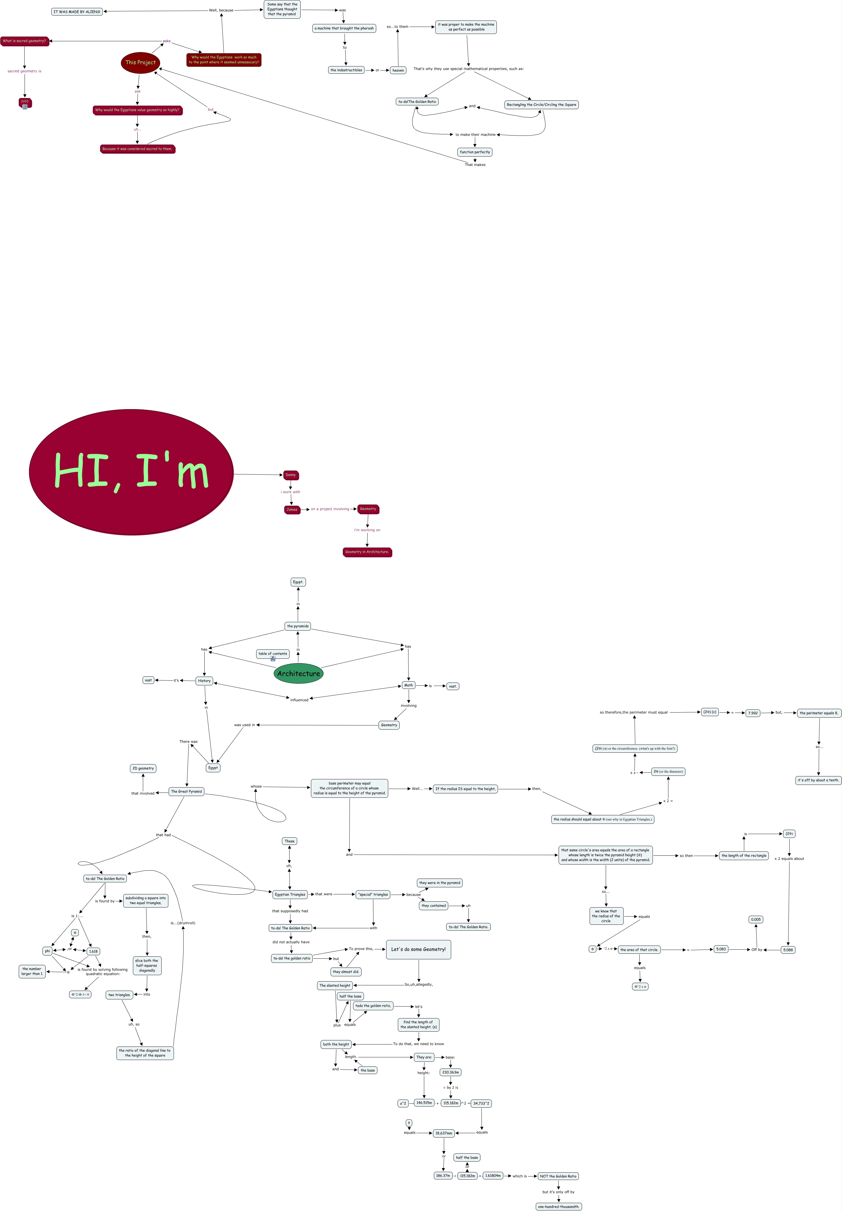 This Concept Map, created with IHMC CmapTools, has information related to: 3D geometry relation to real world -- architecture, 115.182m or half the base, s equals 18,637mm, that same circle's area equals the area of a rectangle whose length is twice the pyramid height (Φ) and whose width is the width (2 units) of the pyramid. so then the length of the rectangle, HI, I'm ???? Danny, Why would the Egyptians work so much to the point where it seemed unnessacary? Well, because IT WAS MADE BY ALIENS!, that same circle's area equals the area of a rectangle whose length is twice the pyramid height (Φ) and whose width is the width (2 units) of the pyramid. so... we know that the radius of the circle, ta-da! the golden ratio but they almost did., The Great Pyramid that had ta-da! The Golden Ratio, tada the golden ratio, let's find the length of the slanted height. (s), find the length of the slanted height. (s) To do that, we need to know both the height, "special" triangles with ta-da! The Golden Ratio, They are: base: 230.363m, phi is found by solving following quadratic equation: Φ^2-Φ-1= 0, ta-da! The Golden Ratio is found by subdividing a square into two equal triangles,, they almost did. To prove this, Let's do some Geometry!, NOT the Golden Ratio but it's only off by one-hundred-thousandth., base perimeter may equal the circumference of a circle whose radius is equal to the height of the pyramid. and that same circle's area equals the area of a rectangle whose length is twice the pyramid height (Φ) and whose width is the width (2 units) of the pyramid., Let's do some Geometry! So,uh,allegedly, The slanted height, subdividing a square into two equal triangles, then, slice both the half-squares diagonally, 1.618 is the number larger than 1.