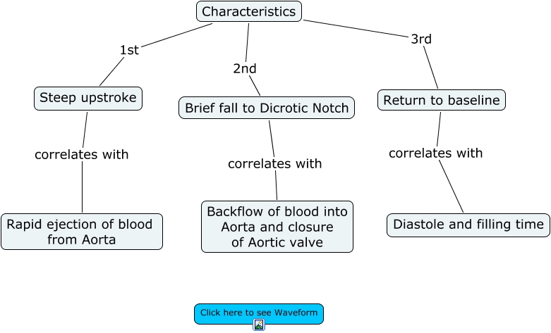 This Concept Map has information related to: Art waveform characteristics, Brief fall to Dicrotic Notch correlates with Backflow of blood into Aorta and closure of Aortic valve, Steep upstroke correlates with Rapid ejection of blood from Aorta, Characteristics 1st Steep upstroke, Return to baseline correlates with Diastole and filling time, Characteristics 3rd Return to baseline, Characteristics 2nd Brief fall to Dicrotic Notch