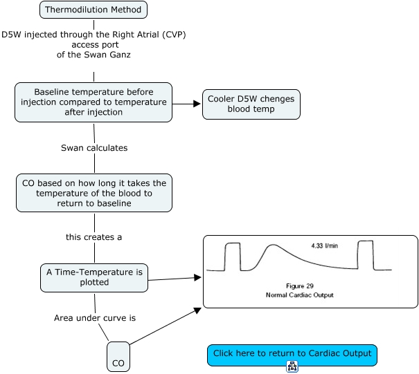 This Concept Map has information related to: Thermodilution Method, CO , A Time-Temperature is plotted ???? , Thermodilution Method D5W injected through the Right Atrial (CVP) access port of the Swan Ganz Baseline temperature before injection compared to temperature after injection, CO based on how long it takes the temperature of the blood to return to baseline this creates a A Time-Temperature is plotted, Baseline temperature before injection compared to temperature after injection ???? Cooler D5W chenges blood temp, A Time-Temperature is plotted Area under curve is CO, Baseline temperature before injection compared to temperature after injection Swan calculates CO based on how long it takes the temperature of the blood to return to baseline