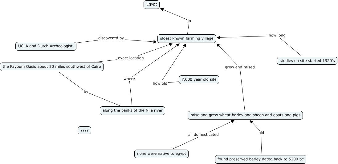 This Concept Map, created with IHMC CmapTools, has information related to: latimes meggie, raise and grew wheat,barley and sheep and goats and pigs grew and raised oldest known farming village, oldest known farming village in Egypt, along the banks of the Nile river where oldest known farming village, studies on site started 1920's how long oldest known farming village, UCLA and Dutch Archeologist discovered by oldest known farming village, none were native to egypt all domesticated raise and grew wheat,barley and sheep and goats and pigs, the Fayoum Oasis about 50 miles southwest of Cairo by along the banks of the Nile river, 7,000 year old site how old oldest known farming village, the Fayoum Oasis about 50 miles southwest of Cairo exact location oldest known farming village, found preserved barley dated back to 5200 bc old raise and grew wheat,barley and sheep and goats and pigs