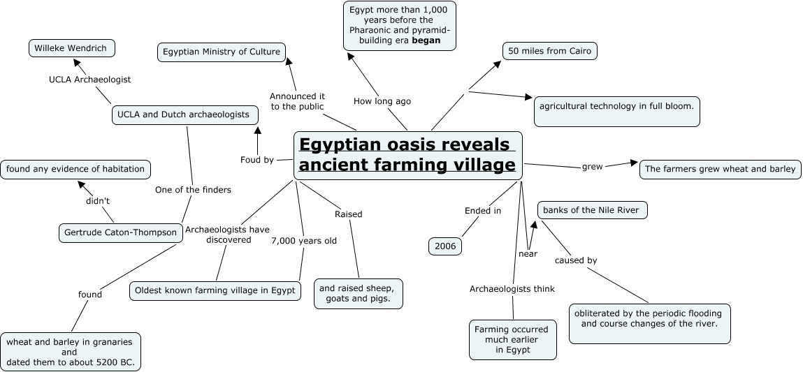 This Concept Map, created with IHMC CmapTools, has information related to: La Times Steven, Egyptian oasis reveals ancient farming village Raised and raised sheep, goats and pigs., Egyptian oasis reveals ancient farming village Foud by UCLA and Dutch archaeologists, UCLA and Dutch archaeologists UCLA Archaeologist Willeke Wendrich, Egyptian oasis reveals ancient farming village How long ago Egypt more than 1,000 years before the Pharaonic and pyramid- building era began, Egyptian oasis reveals ancient farming village 50 miles from Cairo, banks of the Nile River caused by obliterated by the periodic flooding and course changes of the river., Gertrude Caton-Thompson didn't found any evidence of habitation, Egyptian oasis reveals ancient farming village 7,000 years old Oldest known farming village in Egypt, Egyptian oasis reveals ancient farming village Archaeologists think Farming occurred much earlier in Egypt, Egyptian oasis reveals ancient farming village Announced it to the public Egyptian Ministry of Culture, Egyptian oasis reveals ancient farming village Archaeologists have discovered Oldest known farming village in Egypt, Egyptian oasis reveals ancient farming village Ended in 2006, Gertrude Caton-Thompson found wheat and barley in granaries and dated them to about 5200 BC., Egyptian oasis reveals ancient farming village near banks of the Nile River, Egyptian oasis reveals ancient farming village grew The farmers grew wheat and barley, UCLA and Dutch archaeologists One of the finders Gertrude Caton-Thompson, Egyptian oasis reveals ancient farming village agricultural technology in full bloom.