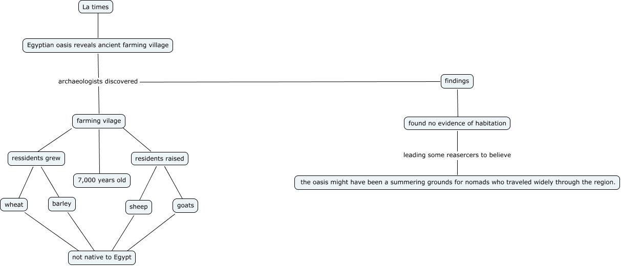 This Concept Map, created with IHMC CmapTools, has information related to: latimes max, ressidents grew ???? wheat, barley ???? not native to Egypt, farming vilage ???? residents raised, goats ???? not native to Egypt, farming vilage ???? 7,000 years old, ressidents grew ???? barley, La times ???? Egyptian oasis reveals ancient farming village, findings archaeologists discovered farming vilage, residents raised ???? goats, sheep ???? not native to Egypt, found no evidence of habitation leading some reasercers to believe the oasis might have been a summering grounds for nomads who traveled widely through the region., farming vilage ???? ressidents grew, wheat ???? not native to Egypt, findings ???? found no evidence of habitation, residents raised ???? sheep, Egyptian oasis reveals ancient farming village archaeologists discovered farming vilage