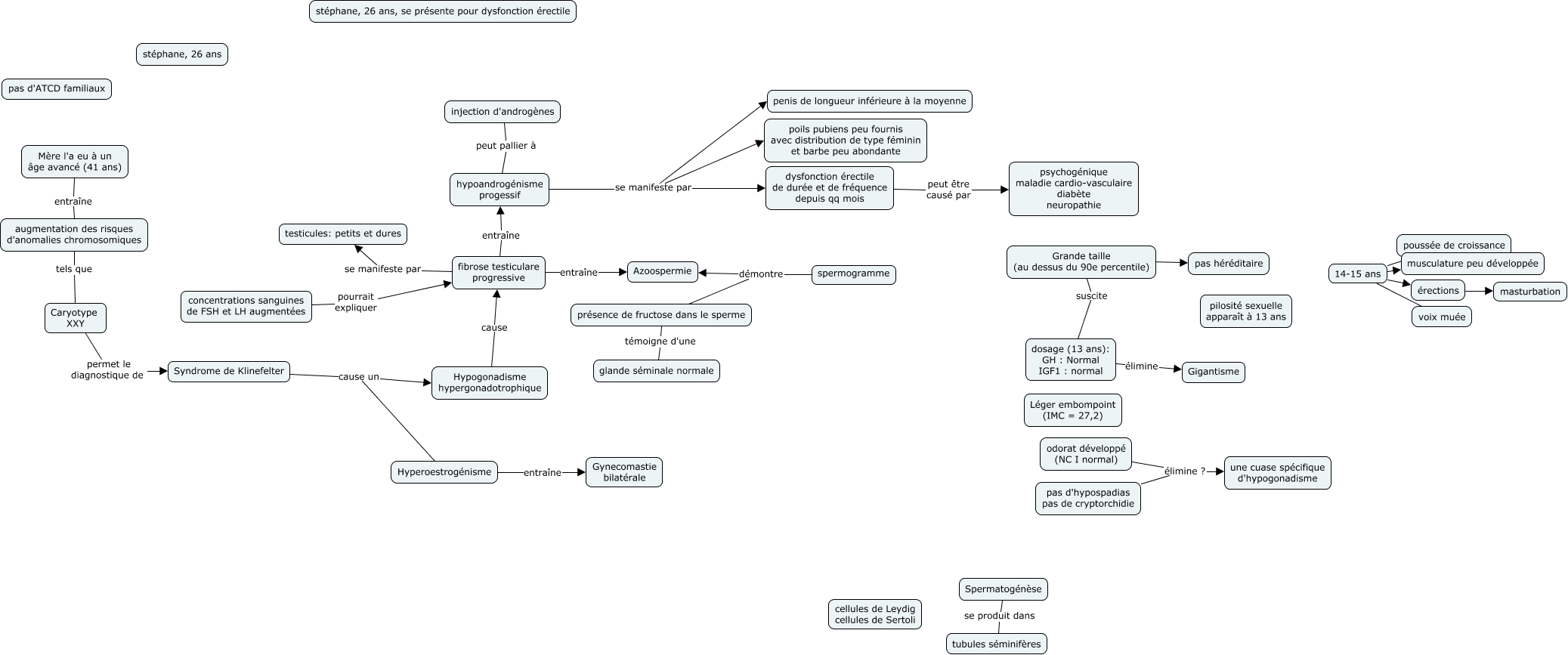 Cette carte de concepts créée avec IHMC CmapTools traite de: App2 naif, fibrose testiculare progressive entraîne Azoospermie, fibrose testiculare progressive se manifeste par testicules: petits et dures, injection d'androgènes peut pallier à hypoandrogénisme progessif, présence de fructose dans le sperme témoigne d'une glande séminale normale, érections masturbation, 14-15 ans musculature peu développée, 14-15 ans poussée de croissance, augmentation des risques d'anomalies chromosomiques tels que Caryotype XXY, dosage (13 ans): GH : Normal IGF1 : normal élimine Gigantisme, spermogramme démontre présence de fructose dans le sperme, 14-15 ans érections, concentrations sanguines de FSH et LH augmentées pourrait expliquer fibrose testiculare progressive, hypoandrogénisme progessif se manifeste par poils pubiens peu fournis avec distribution de type féminin et barbe peu abondante, Syndrome de Klinefelter cause un Hyperoestrogénisme, pas d'hypospadias pas de cryptorchidie élimine ? une cuase spécifique d'hypogonadisme, hypoandrogénisme progessif se manifeste par dysfonction érectile de durée et de fréquence depuis qq mois, Hypogonadisme hypergonadotrophique cause fibrose testiculare progressive, 14-15 ans voix muée, spermogramme démontre Azoospermie, Grande taille (au dessus du 90e percentile) ???? pas héréditaire