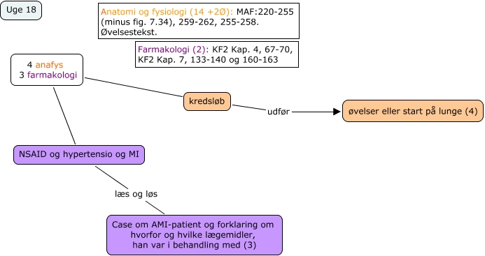 This Concept Map has information related to: TVO-2 uge 18, kredsløb udfør øvelser eller start på lunge (4), 4 anafys 3 farmakologi kredsløb, 4 anafys 3 farmakologi NSAID og hypertensio og MI, NSAID og hypertensio og MI læs og løs Case om AMI-patient og forklaring om hvorfor og hvilke lægemidler, han var i behandling med (3)