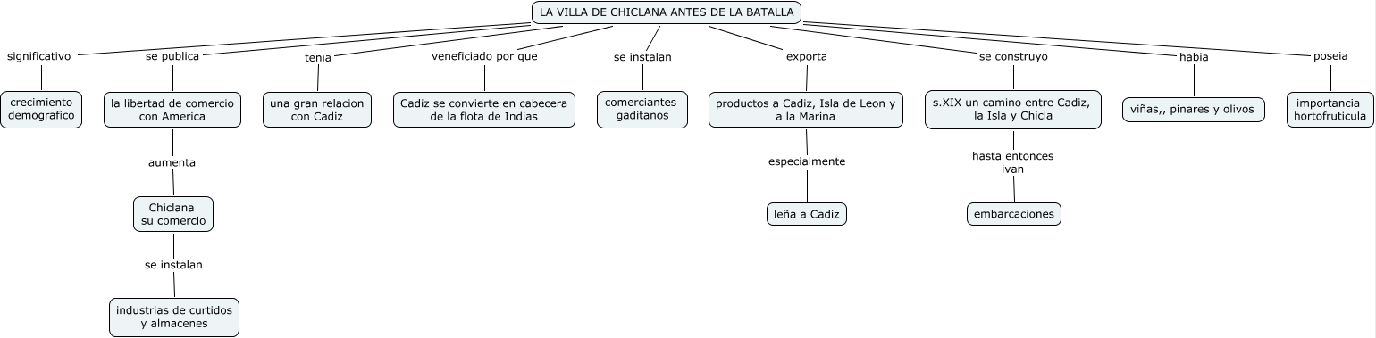 Este mapa conceptual tiene información relacionada a: 04javier chaves suazoantes de la batalla de chiclana, LA VILLA DE CHICLANA ANTES DE LA BATALLA poseia importancia hortofruticula, la libertad de comercio con America aumenta Chiclana su comercio, LA VILLA DE CHICLANA ANTES DE LA BATALLA significativo crecimiento demografico, LA VILLA DE CHICLANA ANTES DE LA BATALLA se instalan comerciantes gaditanos, productos a Cadiz, Isla de Leon y a la Marina especialmente leña a Cadiz, s.XIX un camino entre Cadiz, la Isla y Chicla hasta entonces ivan embarcaciones, LA VILLA DE CHICLANA ANTES DE LA BATALLA exporta productos a Cadiz, Isla de Leon y a la Marina, LA VILLA DE CHICLANA ANTES DE LA BATALLA se construyo s.XIX un camino entre Cadiz, la Isla y Chicla, LA VILLA DE CHICLANA ANTES DE LA BATALLA se publica la libertad de comercio con America, LA VILLA DE CHICLANA ANTES DE LA BATALLA tenia una gran relacion con Cadiz