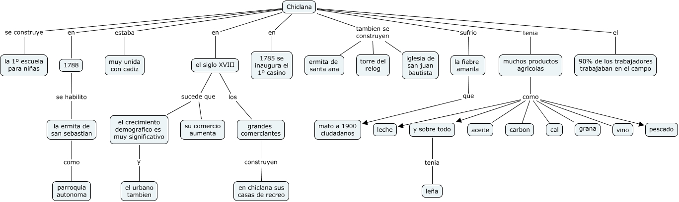 Este mapa conceptual tiene información relacionada a: 20.Pepe Romero Morales.Chiclana antes de la batalla, el siglo XVIII los grandes comerciantes, Chiclana se construye la 1º escuela para niñas, la fiebre amarila que mato a 1900 ciudadanos, Chiclana tambien se construyen torre del relog, muchos productos agricolas como pescado, muchos productos agricolas como aceite, 1788 se habilito la ermita de san sebastian, muchos productos agricolas como leche, muchos productos agricolas como carbon, el crecimiento demografico es muy significativo y el urbano tambien