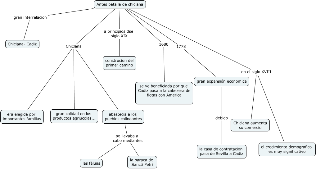 Este mapa conceptual tiene información relacionada a: 02.adolfo avila ruiz.antes de la batalla de chiclana, Antes batalla de chiclana en el siglo XVIII Chiclana aumenta su comercio, Antes batalla de chiclana 1778 gran expansión economica, Antes batalla de chiclana 1680 se ve beneficiada por que Cadiz pasa a la cabezera de flotas con America, Antes batalla de chiclana Chiclana abastecia a los pueblos colindantes, Antes batalla de chiclana Chiclana era elegida por importantes familias, Antes batalla de chiclana en el siglo XVIII el crecimiento demografico es muy significativo, gran expansión economica debido la casa de contratacion pasa de Sevilla a Cadiz, abastecia a los pueblos colindantes se llevaba a cabo mediantes las fáluas, Antes batalla de chiclana a principios dse siglo XIX construcion del primer camino, Antes batalla de chiclana gran interrelacion Chiclana- Cadiz