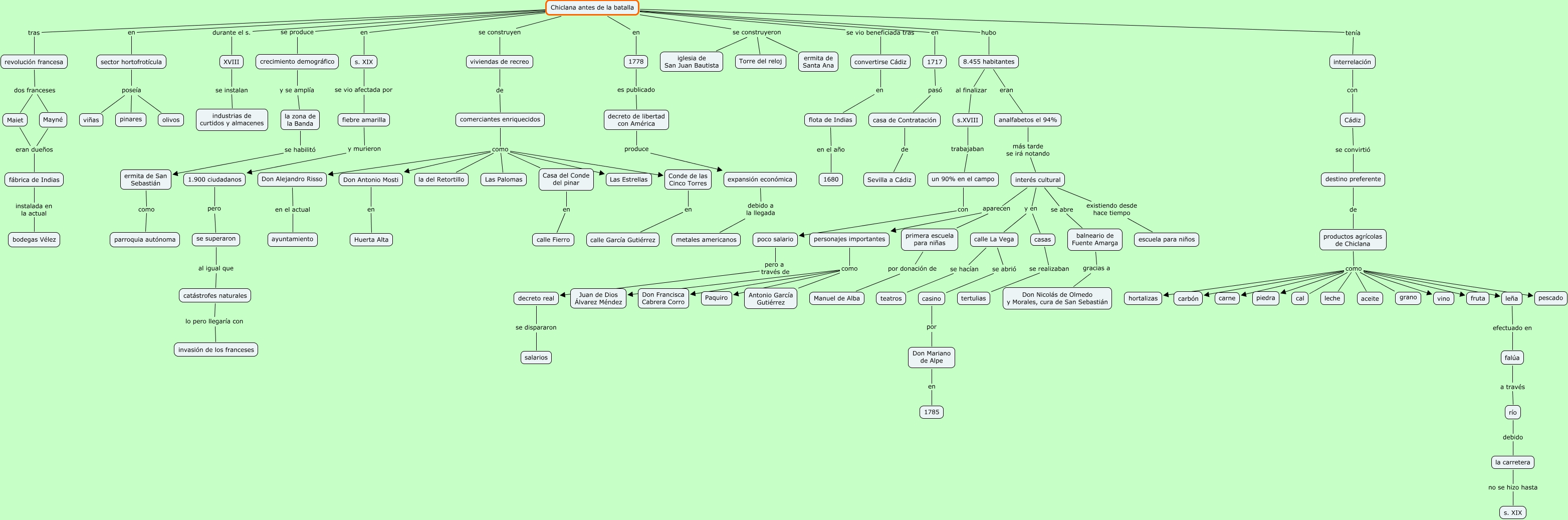 Este mapa conceptual tiene información relacionada a: 12.Laura Montero Acosta. Chiclana antes de la batalla, casino por Don Mariano de Alpe, catástrofes naturales lo pero llegaría con invasión de los franceses, Don Antonio Mosti en Huerta Alta, Chiclana antes de la batalla tenía interrelación, falúa a través río, productos agrícolas de Chiclana como carbón, poco salario pero a través de decreto real, personajes importantes como Antonio García Gutiérrez, se superaron al igual que catástrofes naturales, casas se realizaban tertulias, productos agrícolas de Chiclana como pescado, productos agrícolas de Chiclana como cal, Don Mariano de Alpe en 1785, comerciantes enriquecidos como Casa del Conde del pinar, Cádiz se convirtió destino preferente, productos agrícolas de Chiclana como fruta, s.XVIII trabajaban un 90% en el campo, 1717 pasó casa de Contratación, sector hortofrotícula poseía pinares, casa de Contratación de Sevilla a Cádiz