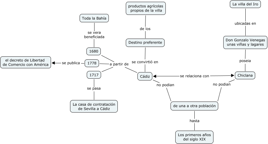 Este mapa conceptual tiene información relacionada a: 09.Alberto Fernández Foncilla.Chiclana antes de la Batalla, 1778 a partir de Cádiz, 1680 a partir de Cádiz, 1717 a partir de Cádiz, Cádiz no podian de una a otra población, Chiclana no podian de una a otra población, 1778 se publica el decreto de Libertad de Comercio con América, productos agrícolas propios de la villa de los Destino preferente, Destino preferente se convirtió en Cádiz, 1717 se pasa La casa de contratación de Sevilla a Cádiz, Toda la Bahía se vera beneficiada 1680