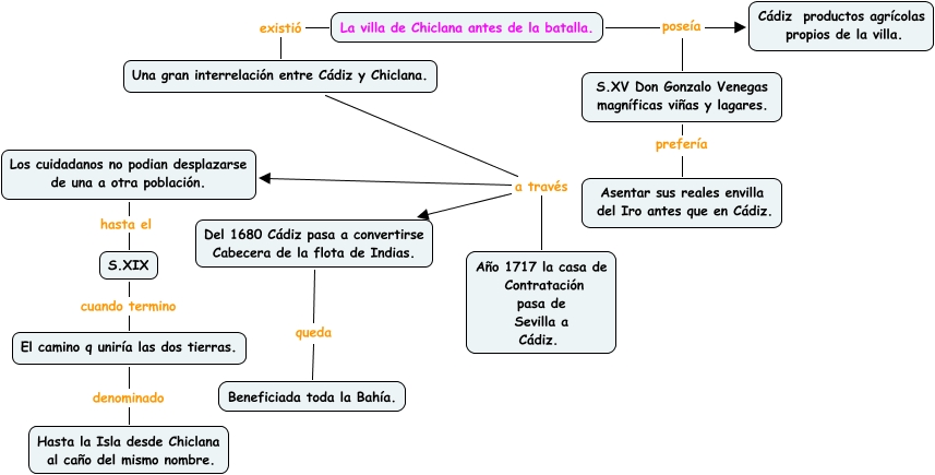 Este mapa conceptual tiene información relacionada a: 11.Ana Estrada Serrano.Chiclana antes de la batalla, Del 1680 Cádiz pasa a convertirse Cabecera de la flota de Indias. queda Beneficiada toda la Bahía., S.XIX cuando termino El camino q uniría las dos tierras., Una gran interrelación entre Cádiz y Chiclana. a través Año 1717 la casa de Contratación pasa de Sevilla a Cádiz., La villa de Chiclana antes de la batalla. poseía S.XV Don Gonzalo Venegas magníficas viñas y lagares., Una gran interrelación entre Cádiz y Chiclana. a través Los cuidadanos no podian desplazarse de una a otra población., Una gran interrelación entre Cádiz y Chiclana. a través Del 1680 Cádiz pasa a convertirse Cabecera de la flota de Indias., La villa de Chiclana antes de la batalla. existió Una gran interrelación entre Cádiz y Chiclana., S.XV Don Gonzalo Venegas magníficas viñas y lagares. prefería Asentar sus reales envilla del Iro antes que en Cádiz., Los cuidadanos no podian desplazarse de una a otra población. hasta el S.XIX, La villa de Chiclana antes de la batalla. poseía Cádiz productos agrícolas propios de la villa.